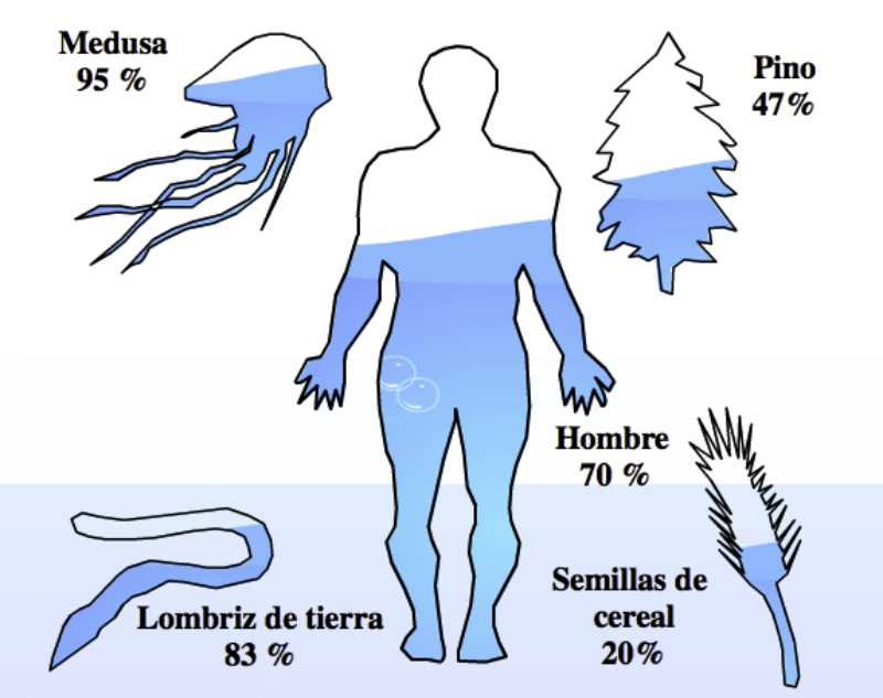 seres vivos contienen entre el 65 y el 90% de agua. Además