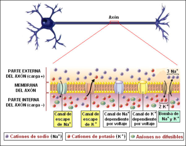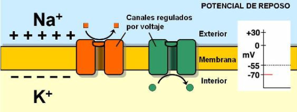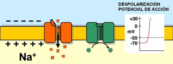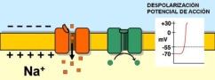 La capacidad de captar estímulos y emitir respuestas se debe a la excitabilidad neuronal, es decir, a la generación de impulsos nerviosos gracias a un potencial de membrana.2.1.1. POTENCIAL DE MEMBRANA O DE REPOSOEl potencial de membrana es la diferencia de potencial entre el exterior y el interior de la membrana plasmática. Esta diferencia se debe a una acumulación de cargas de distinto signo y es de unos -70 milivoltios (mV). El signo menos indica que en el interior hay más cargas negativas, debido al Cl- y a proteínas con carga negativa.La bomba de Na+/K+: se encuentra en la membrana plasmática y saca de la células iones Na+ al tiempo que introduce iones K+, lo que provoca un desequilibrio.Canales de K+: los canales de K+ se hallan siempre abiertos, por lo que el K+, muy abundantes en el interior, tienden a salir a favor de gradiente químico. Sin embargo la alta concentración de cargas negativas en el interior se opone a esta salida (gradiente eléctrico).Potencial de membrana: cuando ambos gradientes se equilibran, se alcanza el potencial en reposo o potencial de membrana, que es de unos -70 mV.2.1.2. DESPOLARIZACIÓN: POTENCIAL DE ACCIÓNLa presencia de un estímulo abre los canales de Na+ y cierra los de K+. Al entrar masivamente Na+ a favor de gradiente, se alcanza el umbral de excitación, que termina haciendo positivo el interior celular. Se da así una despolarización, que puede llevar el potencial a +40 mV, momento en que se alcanza el potencial de acción, que genera un impulso nervioso que se propaga por el axón hasta la siguiente neurona a través de la sinapsis.2.1.3. REPOLARIZACIÓNLa repolarización consiste en recuperar el potencial de -70 mV. Tras una excitación, se cierran los canales de Na+, se abren los de K+ y vuelve a actuar la bomba de Na+/K+. Durante la repolarización (unos milisegundos) la neurona no puede reaccionar a un estímulo y se dice que está en periodo refractario.