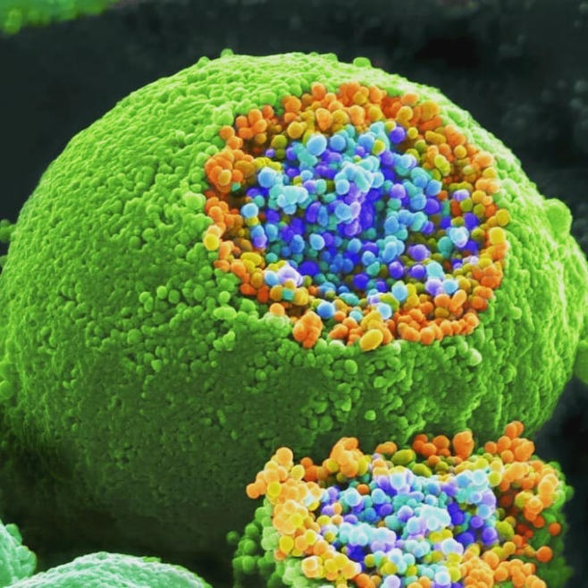 Terminación nerviosa que se ha roto para revelar las vesículas sinápticas (naranjas y azules) debajo de la membrana celular (verde).Imagen: @cell_image_library