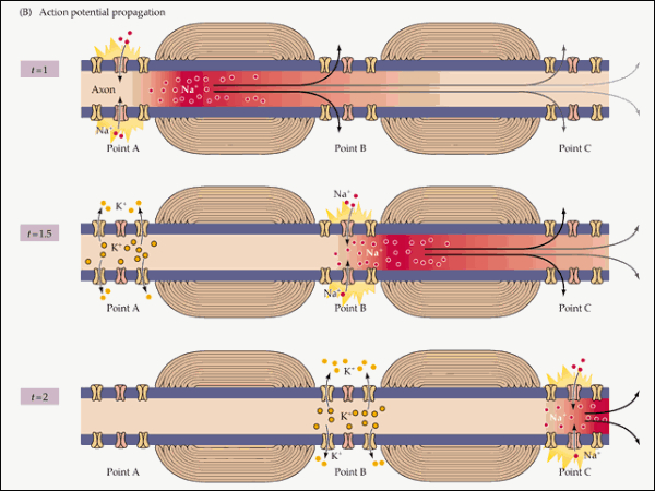 El impulso nervioso ocasionado por el potencial de acciónse transmite por toda la neurona, desde las dendritas hacia el axón y los botones sinápticos. Esto se consigue con la apertura y cierre sucesivo de los diferentes canales iónicos. La despolarización se transmite de forma similar.Las neuronas más gruesas y las mielinizadas transmiten el impulso mucho más deprisa, gracias a la conducción saltatoria de un nódulo de Ranvier al siguiente.