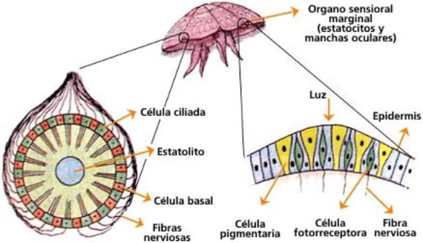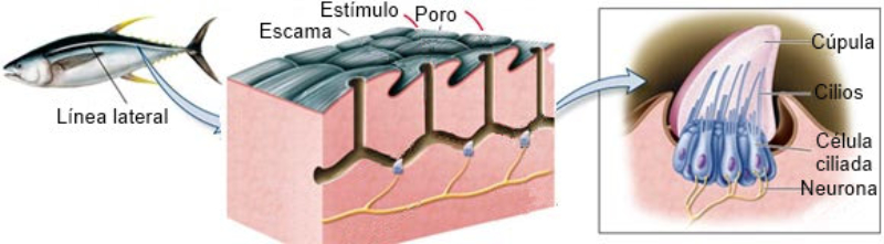 Perciben energía mecánica: presión (propiorreceptores y receptores táctiles), gravedad (estatorreceptores) o sonido (fonorreceptores).3.1.1. PROPIORRECEPTORESMecanorreceptores internos que informan de la contracción muscular, la tensión de los tendones, la posición y el movimiento de articulaciones.3.1.2. RECEPTORES TÁCTILESEn invertebrados, principalmente insectos, existen pelos táctiles repartidos por todo el cuerpo, llamados sensilias, que captan vibraciones y contacto.En vertebrados son mucho más complejos. Hay pelos táctiles (vibrisas), pero la mayoría de estos receptores están en la dermis y detectan frío, calor, dolor y presión, dando lugar al sentido del tacto.3.1.3. ESTATORRECEPTORESDetectan cambios en la gravedad y, por tanto, determinan la posición del cuerpo y el equilibrio.En invertebrados el estatorreceptor es un saco llamado estatocisto. Este saco está lleno de líquido y revestido interiormente de células ciliadas sensoriales. En el interior hay una concreción calcárea llamada estatolito. Al moverse el animal, se mueve el estatolito, que presiona sobre las células ciliadas que mandan información sobre el cambio de posición. Suelen situarse en la cabeza (tentáculos, antenas,…).En vertebrados los estatorreceptores del equilibrio se localizan en el oído interno, dentro del sáculo y el utrículo. En ellos hay células ciliadas con estatolitos llamados otolitos. A su lado se hallan los canales semicirculares, órganos que informan del movimiento de la cabeza. Cada canal tiene en uno de sus extremos un ensanchamiento llamado ampollacon células ciliadas.3.1.4. FONORRECEPTORESSon receptores del sonido, vibraciones y variaciones de presión en el aire o el agua. Los más importantes son el oídoy la línea lateral.Oído: sólo presente en animales capaces de emitir sonido: artrópodos (crustáceos, arañas, insectos) y en los vertebrados. La localización en invertebrados es muy variable (antenas de mosquitos, patas de grillos, tórax de cigarras, abdomen de saltamontes, …).En los vertebrados se sitúa a los lados de la cabeza y es muy complejo. Suele tener un oído externo (pabellón auricular u oreja y conducto auditivo); oído medio(tímpano, cadena de huesecillos (martillo, yunque y estribo) y trompa de Eustaquio); y oído interno(caracol o cóclea, canales semicirculares, sáculo y utrículo).Línea lateral: aunque los peces tienen oído interno, sólo contiene los receptores del equilibrio (canales semicirculares, utrículo y sáculo) y carece de caracol, por lo que no funciona como fonorreceptor. Las vibraciones que forman el sonido las recibe mediante un órgano especial llamado línea lateral. Son tuberías de los costados del animal, llenas de líquido y con células sensoriales ciliadas que detectan las vibraciones del agua y la procedencia de las mismas.Ecolocación: algunos animales utilizan el sonido como un radar. Emiten sonidos cuyo eco les permite detectar presas u obstáculos incluso en la oscuridad. Es propio de murciélagos y delfines, por ejemplo. También lo tienen algunas aves que viven en cuevas (vencejos) y algunos mamíferos como el cachalote.