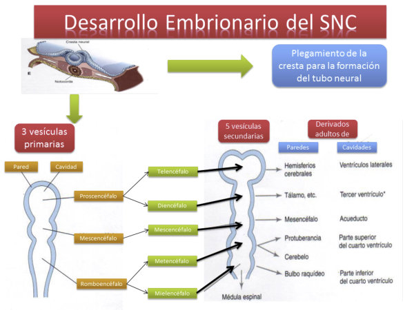 En vertebrados el procesamiento de la información se realiza principalmente en una estructura nerviosa muy compleja: el sistema nervioso central (SNC), formado por el encéfalo(encerrado en el cráneo) y la médula espinal (protegida por la columna vertebral). Del SNC parten nervios que, junto a los ganglios simples forman el sistema nervioso periférico (SNP).A partir del tubo neural del embrión se forma el cordón hueco de la médula espinal y, en su parte anterior, se ensancha para dar el encéfalo, que presenta tres regiones:Prosencéfalo: o encéfalo anterior, que incluye al cerebro.Mesencéfalo: o encéfalo medio.Rombencéfalo: que incluye el cerebelo y el bulbo raquídeo.