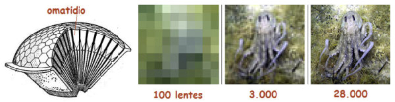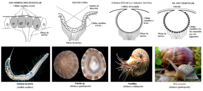 Los fotorreceptores son células sensibles a la luz gracias a pigmentos llamados rodopsinas. Estas células suelen agruparse formando la retina, la parte fotosensible del ojo u órgano de la visión. Básicamente, existen dos tipos de ojos: simples y compuestos.3.6.1. OJOS SIMPLESOcelo o mancha ocular: simples células sensibles en la superficie corporal. Típicos de cnidarios.Ojo en copa: la retina forma una depresión, lo que permite detectar la dirección de la luz. Carece de cristalino, por lo que no puede captar imágenes, sólo luces y sombras. Se halla en platelmintos (planarias).Ojo vesicular: tiene córnea y cristalino gelatinoso, por lo que puede enfocar las imágenes. Aparece en anélidos y gasterópodos.Ojo en cámara: el ojo es un globo con tres capas: esclerótica (con la parte anterior, la córneatransparente para el paso de luz); la coroides(vascularizada) y la retina. En la retina hay dos tipos de células fotosensibles: los bastones (visión nocturna en blanco y negro) y los conos (visión diurna en color: los hay para el rojo, el azul y el verde). Además, aparece un cristalino transparente (que actúa de lente para enfocar) y el iris (músculos que actúan como un diafragma, controlando la entrada de luz a través de un orificio central, la pupila). Aparece en vertebrados y en cefalópodos.3.6.2. OJOS COMPUESTOSAparecen en artrópodos. Están formados por multitud de unidades llamadas omatidios. cada omatidio capta una parte del campo visual del animal. Contiene una lente o faceta(formada por la córnea y un cono cristalino transparente). La lente concentra y dirige la luz a los fotorreceptores, llamados células retinianas. El cerebro integrará todas las imágenes de los omatidios para dar una imagen en mosaico, pixelada y con poca resolución, pero muy eficaz para detectar movimientos.