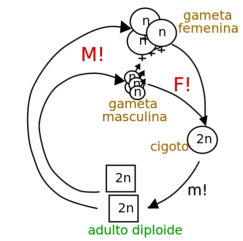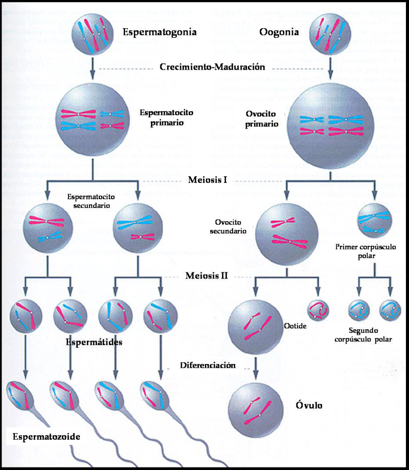 Los animales tienen un ciclo diplonte, ya que los adultos son diploides y las únicas células haploides son los gametos, formados por meiosis.La gametogénesis es la formación de gametos, mediante meiosis, en órganos llamados gónadas. Las gónadas masculinas se denominan testículos y producen espermatozoides. Las gónadas femeninas se llaman ovariosy fabrican óvulos.Espermatogénesis: formación de gametos masculinos o espermatozoides. Se parte de células madre llamadas espermatogonias (2n). Éstas se multiplican y crecen formando espermatocitos primarios (2n) que entran en meiosis. La 1ª división meiótica origina 2 espermatocitos secundarios (n) que, tras la 2ª división, originarán 4 espermátidas (n). Las espermátidas sufren un proceso de diferenciación que las convierte en espermatozoides (n).Ovogénesis u oogénesis: formación de gametos femeninos u óvulos. Se parte de células madre llamadas ovogonias, que se multiplican y crecen dando ovocitos primarios. Tras la primera meiosis se forman dos células haploides: el ovocito secundario, con casi todo el citoplasma, y un corpúsculo polar (célula muy pequeña y sin función). En la 2ª meiosis el ovocito secundario dará una célula grande, la ovótida (n), y otro corpúsculo polar. Finalmente, la ovótida se diferenciará en un único óvulo (n).3.1.1. ORGANISMOS UNISEXUALESLa mayor parte de los animales son unisexuales. Los sexos están separados, por lo que hay machos (con testículos) y hembras (con ovarios). En algunas especies machos y hembras apenas son diferenciables externamente. En otros casos tienen morfología muy distinta: dimorfismo sexual .3.1.2. HERMAFRODITASAlgunos animales pueden fabricar tanto gametos masculinos como femeninos. Se llaman hermafroditas. Pueden tener gónadas independientes para cada tipo de gameto (testículosy ovarios) o bien una única gónada (ovotestis ).El hermafroditismo suele ser una adaptación a la vida sedentaria y el parasitismo interno.Aunque algunos hermafroditas presentan autofecundación(tenia), la mayoría tiene fecundación cruzada, en la que un individuo actúa como masculino y otro como femenino (o bien ambos). Incluso hay animales con hermafroditismo sucesivo o secuencial, en que el individuo cambia de sexo a lo largo de su vida.