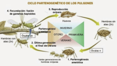 La fecundación es el mecanismo que permite la unión de los gametos para formar un cigoto o célula huevo. Requiere de movilidad de uno o ambos gametos y un medio acuoso. Hay dos tipos:Fecundación externa: típica de animales acuáticos y algunos terrestres (anfibios). Machos y hembras liberan sus gametos al agua, donde se da la fecundación, que es poco eficiente y por ello se producen gran cantidad de gametos.Fecundación interna: se da en algunos animales acuáticos (tiburones) y la mayoría de los terrestres. El semen masculino (líquido que contiene los espermatozoides) ha de llegar al interior de la hembra. Para ello pueden unirse las aberturas genitales (beso cloacal de aves), pero generalmente los machos poseen un órgano copulador que introducen en lo órganos receptores de la hembra.3.2.1. APAREAMIENTO Y CUIDADO DE LA CRÍAPara facilitar el acercamiento entre los sexos, los animales han desarrollado conductas de apareamiento más o menos complejas. Estas conductas están influidas por los caracteres sexuales secundarios, que estimulan la conducta, así como por feromonas, señales químicas que alteran el comportamiento.El apareamiento a menudo va precedido de un cortejo que puede ser muy rápido o durar días. El cortejo es especialmente complejo y largo en aves y mamíferos.Tras el nacimiento de las crías se desarrollan diferentes conductas de cuidado de cría. En general, en la evolución se aprecia una tendencia a tener menos crías más desarrolladas e invertir más tiempo en su cuidado por parte de los padres.3.2.2. PARTENOGÉNESISLa partenogénesis es un tipo de reproducción en el que el óvulo se desarrolla sin ser fecundado. Es bastante común en invertebrados (platelmintos, rotíferos, crustáceos, pulgones, insectos sociales…). En vertebrados es raro, habiéndose descrito casos en peces, anfibios y reptiles (incluidas las aves). La partenogénesis puede ser:Sexual o meiótica: los óvulos se desarrollan por meiosis, por lo que son haploides.Asexual, ameiótica o mitótica: los óvulos se forman por mitosis, por lo que son diploides (básicamente es reproducción asexual).