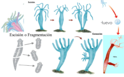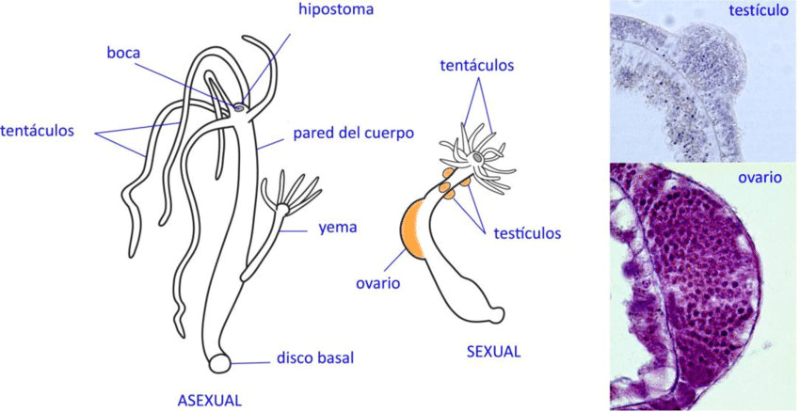 Gemación (asexual) y gónadas (sexual) en pólipos.