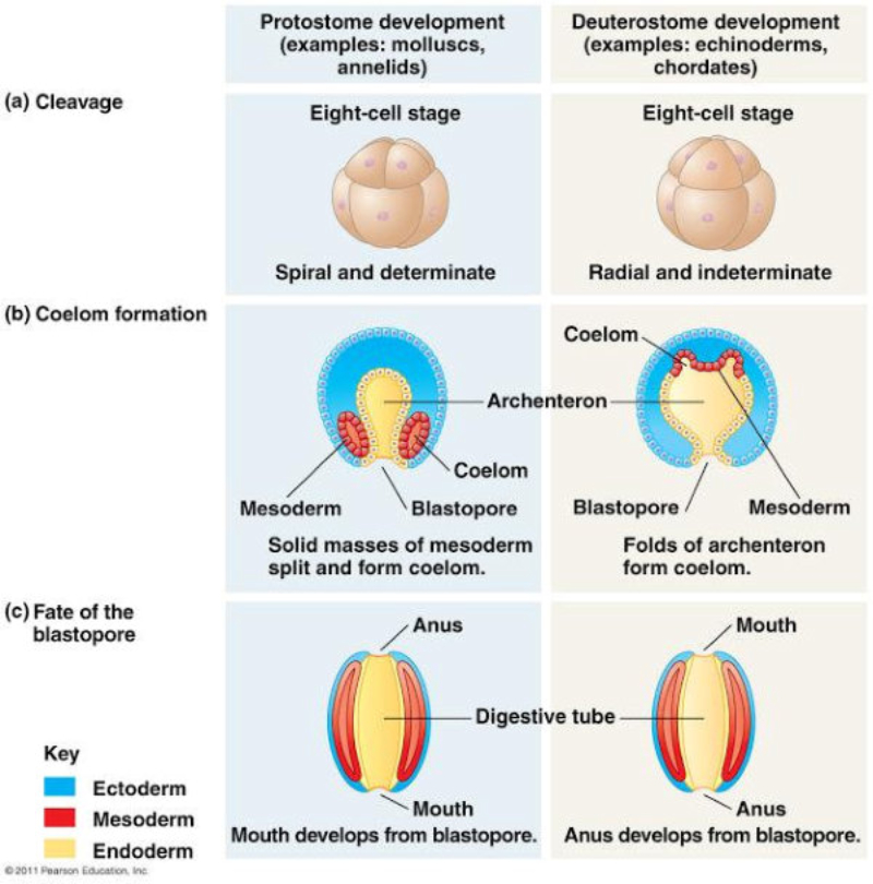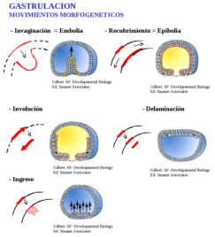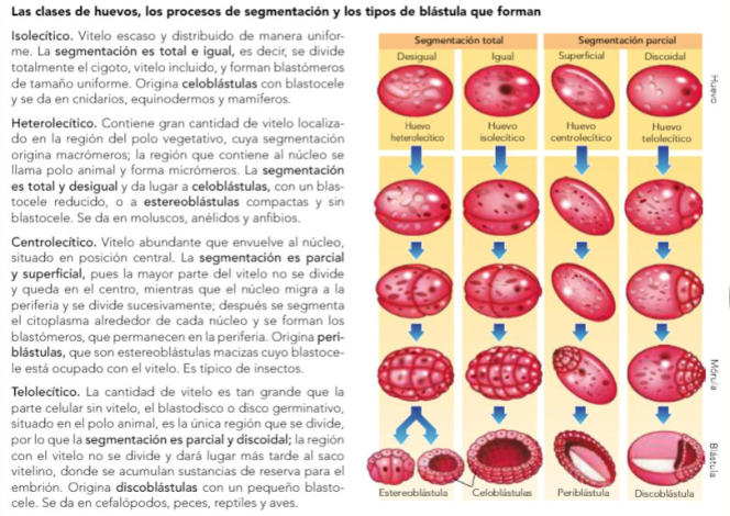El desarrollo embrionario consiste en la formación del embrión a partir del cigoto y sus transformaciones hasta el nacimiento. Se realiza merced a sucesivas divisiones mitóticas del cigoto.Durante este proceso las células sufren diferenciación, lo que las lleva a la especialización y la formación de tejidos.Según el lugar donde tenga lugar el desarrollo de la célula huevo se distinguen tres tipos de animales:Ovíparos: las hembras ponen huevos que se desarrollan en el exterior a expensas del vitelo (reservas nutritivas). El nacimiento es por eclosión.Ovovivíparos: el huevo permanece en el interior de la hembra, donde se desarrolla a expensas del vitelo y eclosiona. Las crías salen después de la madre.Vivíparos: el embrión se desarrolla dentro de la madre, que lo alimenta. El nacimiento es por parto.El desarrollo embrionario presenta diversas fases: segmentación (mórula y blástula), gastrulación y organogénesis.3.3.1. SEGMENTACIÓN: MÓRULA Y BLÁSTULAMórula: el cigoto comienza a dividirse (segmentación) por mitosis sucesivas dando células llamadas blastómeros. Los blastómeros acaban formando una masa sólida de células llamada mórula. En huevos con mucho vitelo existe en la mórula un polo animal (con blastómeros numerosos y pequeños: micrómeros) y un polo vegetativo (donde está el vitelo, con blastómeros escasos y grandes: macrómeros).Blástula: los blastómeros de la mórula se dirigen a la periferia, formando una esfera hueca de células llamada blástula . Las células forman una capa llamada blastodermo que rodea una cavidad llamada blastocele, cuyo tamaño es menor cuanto más vitelo.3.3.2. GASTRULACIÓN: FORMACIÓN DE HOJAS EMBRIONARIASLa gastrulación consiste en plegamientos de la blástulahasta formar una estructura con varias capas denominada gástrula.La gastrulación origina las llamadas hojas embrionarias, que darán lugar a los diferentes tejidos y órganos. En animales diblásticos (poríferos, cnidarios) sólo hay dos hojas: ectodermo y endodermo. En los triblásticos (todos los demás grupos) existe una tercera hoja en medio de las otras: el mesodermo.La gastrulación puede darse mediante tres mecanismos: embolia, epibolia y delaminación.Embolia o invaginación: se da en blástulas con gran blastocele. La pared de la blástula se invagina, haciendo desaparecer el blastocele y originando una nueva cavidad: el arquénteron, que se comunica al exterior por el blastoporo. El blastoporo puede originar la boca (animales protóstomos: la mayoría de invertebrados) o el ano (animales deuteróstomos: equinodermos y cordados).Epibolia (o recubrimiento): se da en blástulas con poco blastocele. Los micrómeros del polo animal envuelven a los macrómeros del vegetativo. En este polo se formará la cavidad del arquénteron con su blastoporo.Delaminación: en blástulas con blastocele lleno de vitelo. Los blastómeros superficiales se dividen por mitosis y forman una capa interna que será el endodermo, quedando las externas como ectodermo. Hay arquénteron pero no blastoporo.En todos los animales triblásticos se forma una tercera capa entre ecto y endodermo: el mesodermo. El mesodermo puede permanecer macizo, sin hueco (animales acelomados: platelmintos, rotíferos,…), o puede desarrollar un hueco interno o celoma (animales celomados: anélidos, moluscos, artrópodos, equinodermos y cordados).3.3.3. ORGANOGÉNESISLa organogénesis es el proceso de formación de tejidos y órganos a partir de las hojas embrionarias. Se produce por diversos mecanismos de diferenciación celular.Cada hoja embrionaria formará una serie de tejidos y órganos:Ectodermo: epidermis y anejos (pelo, plumas, uñas, …); receptores sensitivos y tejido nervioso.Endodermo: digestivo, respiratorio, urinario y endocrino.Mesodermo: dermis, reproductor, conjuntivo, excretor, circulatorio, muscular y esquelético.