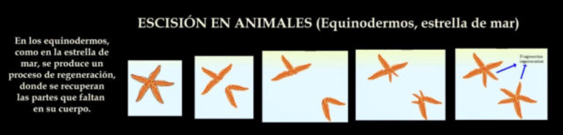 Es una manera rápida y sencilla de reproducirse y sólo requiere un progenitor. Existen diversos tipos:Gemación: el nuevo individuo se forma a partir de una yema, un grupo de células que crece sobre el progenitor (esponjas, cnidarios). La yema termina desprendiéndose y dando un nuevo individuo. En ocasiones, el nuevo individuo puede quedar unido al parental, formando colonias (corales).Gemulación: el parental forma estructuras protectoras (gémulas) que actúan de formas de resistencia. Cuando las condiciones son adecuadas las gémulas desarrollan un nuevo individuo (esponjas dulceacuícolas).Escisión: es la fragmentación del organismo parental en dos o más partes, cada una de las cuales formará un nuevo individuo. Puede ser longitudinal (hidra de agua), transversal (gusanos poliquetos) o por estrobilación (escisión múltiple transversal típica de algunos cnidarios).Relacionada con la escisión está la regeneración, que es la capacidad de cerrar heridas o regenerar partes completas del cuerpo perdidas por accidente (estrellas de mar, gusanos, crustáceos, anfibios,…).