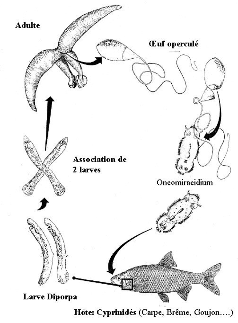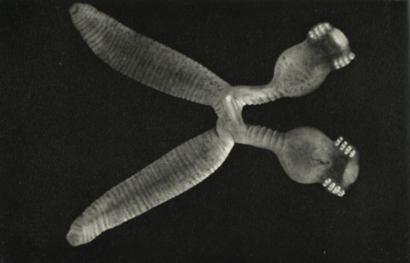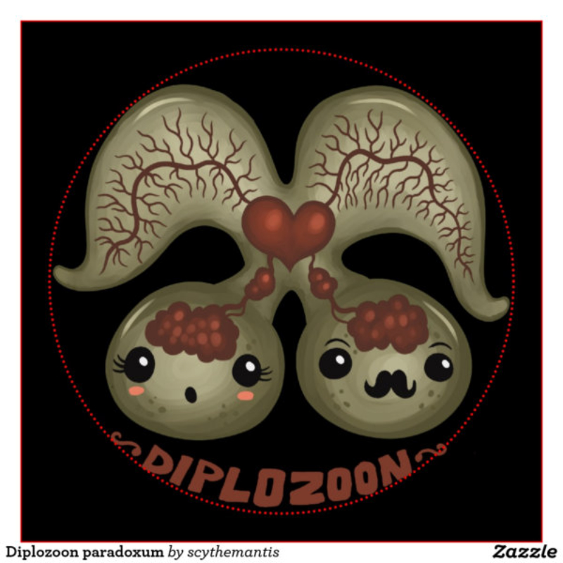 Imágenes del platelminto Diplozoon paradoxum, un parásito de agallas de peces. Cuando dos larvas se encuentran se fusionan y permanecen así toda la vida realizando fecundación cruzada.
