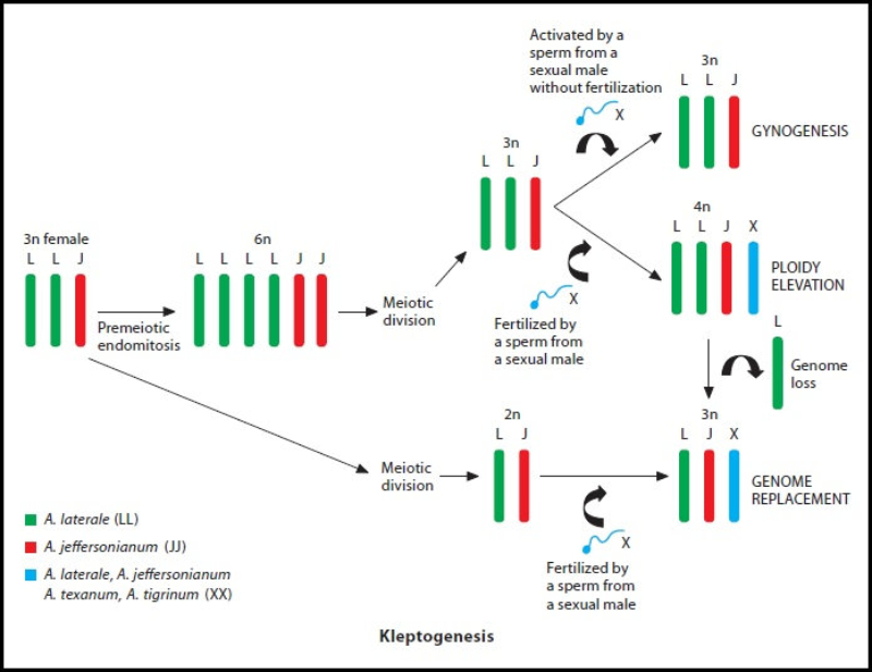 Kleptogénesis(griego kleptein: “robar”)Los cleptones o kleptones son especies que necesitan de otra para su ciclo reproductor. En anfibios se debe a la formación de híbridos. Un caso espectacular es el del complejo Ambystoma en el que 5 especies interactúan entre sí, dado individuos desde diploides a pentaploides.