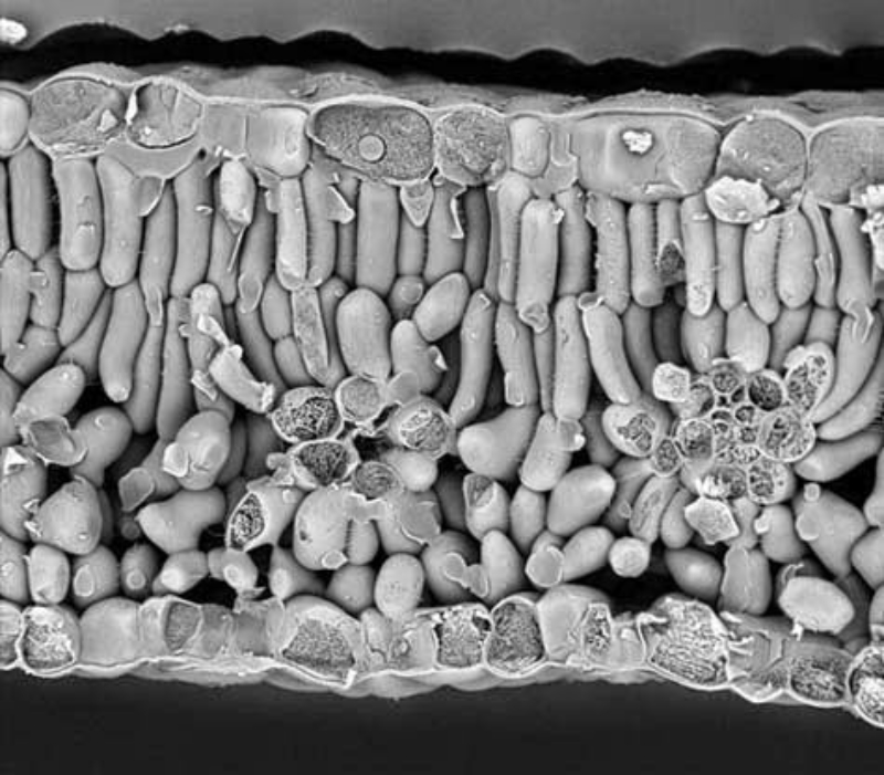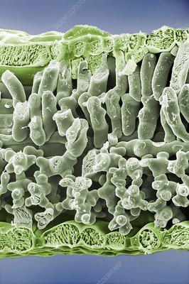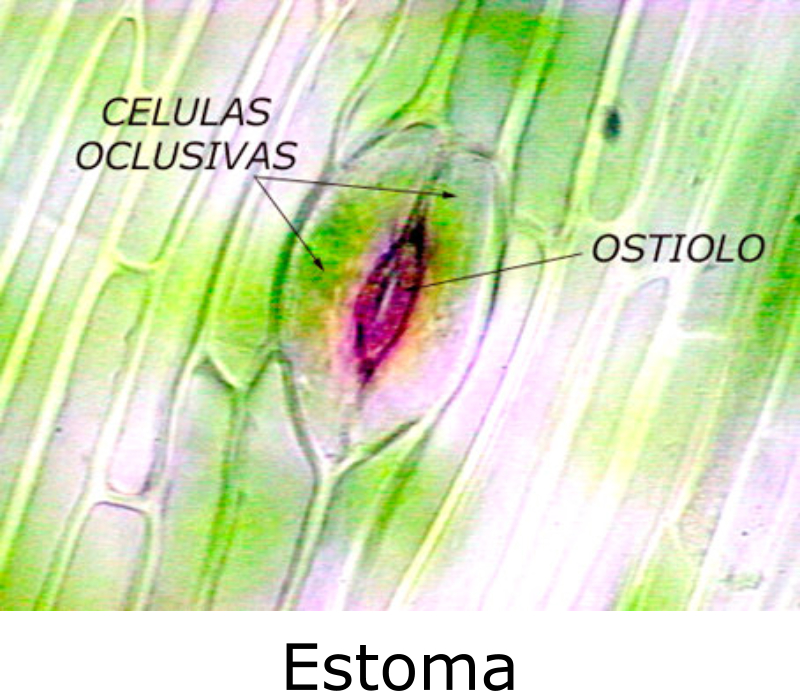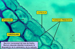 Las hojas son estructuras generalmente laminares, de crecimiento limitado, que aparecen en los nudos del tallo. Las hojas son los principales órganos fotosintéticos gracias a sus numerosas células con cloroplastos. También se encargan del intercambio de gases. Morfología de la hoja Una hoja típica consta de las siguientes partes: Vaina: base de la hoja, donde se inserta en el tallo. Puede presentar pequeñas hojas secundarias llamadas estípulas. Peciolo: pedúnculo que une el limbo al tallo. Se continúa con el nervio central de la hoja, el cual puede ramificarse o dar nervios paralelos. Si no hay peciolo se dice que las hojas son sentadas. Limbo: parte normalmente laminar, ancha, Tiene una cara superior o haz y otra inferior o envés. En el limbo sobresalen los nervios, haces de vasos conductores procedentes del tallo. Estructura de la hoja En un corte transversal de una hoja se aprecian, desde el haz al envés, las siguientes capas: Epidermis superior: una única capa de células que cubre el haz, puede tener algunos estomas y, a veces, pelos. Sobre ella se sitúa la cutícula, que impermeabiliza la hoja. Mesófilo o parénquima clorofílico: contiene células con cloroplastos que realizan la fotosíntesis. Las células cercanas al haz son prismática, muy juntas, y forman el parénquima en empalizada. En el envés las células son redondeadas, con grandes huecos entre ellas que se comunican con los estomas, formando el parénquima lagunar. Epidermis inferior: similar a la superior, pero con numerosos estomas y una cutícula más fina. Nervios: entre las células del mesófilo se sitúan haces conductores, con xilema y floema, que suelen sobresalir en la superficie de la hoja formando nervios.