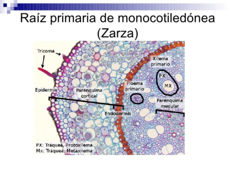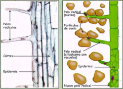 Órgano normalmente subterráneo, de crecimiento ilimitado hacia el interior de la tierra. Las raíces actúan de sostén, absorben agua y sales y en ocasiones acumulan reservas. Estructura de la raíz La raíz puede presentar dos tipos de estructura: primaria (en plantas anuales o de menos de un año, con crecimiento sólo en longitud); y secundaria (en plantas de más de un año, con crecimiento en grosor). Estructura primaria: en un corte a nivel de los pelos radicales se aprecian dos zonas concéntricas: el cilindro cortical o corteza y el cilindro central o vascular. Cilindro cortical o corteza: abarca la rizodermis con los pelos radicales, el parénquima cortical (con varias capas de células que almacenan biomoléculas) y la endodermis, una capa única que delimita internamente la corteza. Cilindro central o vascular: contiene al xilema y al floema, en radios alternos, inmersos en el parénquima medular o médula y rodeados por el periciclo, capa meristemática que origina las raíces secundarias. Estructura secundaria: la raíz adulta presenta dos nuevas capas que son meristemos, es decir, zonas de crecimiento. Por un lado está el cambium, en el cilindro vascular, separando xilema y floema. Así, el cambium produce anualmente capas de floema o líber hacia el exterior y xilema o leño hacia el interior. El otro meristemo presente es el felógeno, situado en el parénquima cortical, y que produce súber protector hacia el exterior y felodermis hacia el interior.