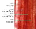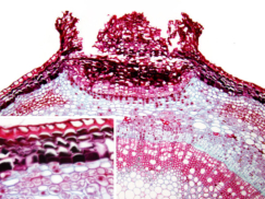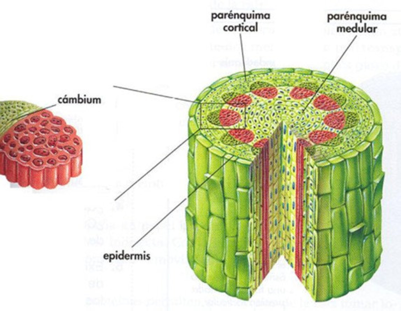 El tallo suele ser la parte aérea de la planta. Tiene crecimiento ilimitado en contra de la gravedad y en él se desarrollan hojas y flores. El tallos sostiene hojas, flores y frutos, conduce la savia en todas direcciones y almacena sustancias de reserva. Estructura del tallo Como en la raíz, el tallo tiene una estructura primaria en plantas jóvenes y una estructura secundaria en las de más de un año. Estructura primaria: presenta dos cilindros concéntricos: el cilindro cortical o corteza y el cilindro central o vascular. Cilindro cortical o corteza: formado por la epidermis, con estomas pero sin cloroplastos; el parénquima cortical, con varias capas con cloroplastos; y la endodermis, que tiene células con granos de almidón. Cilindro central o vascular: formado por el xilema y floema, agrupados en haces mixtos, con el líber hacia afuera y el leño hacia adentro. En medio hay haces de parénquima medular o médula, almacén de sustancias. Rodeando el conjunto hay varias capas de periciclo. Estructura secundaria: similar a la de la raíz. Entre xilema y floema aparece el cambium, que formará capas anuales de líber al exterior y leño al interior. Igualmente, aparece un felógeno en el cilindro cortical, formando felodermis al interior y súber o corcho al exterior. En plantas monocotiledóneas no existe estructura secundaria y, por tanto, no hay crecimiento en grosor, pues suelen ser herbáceas.