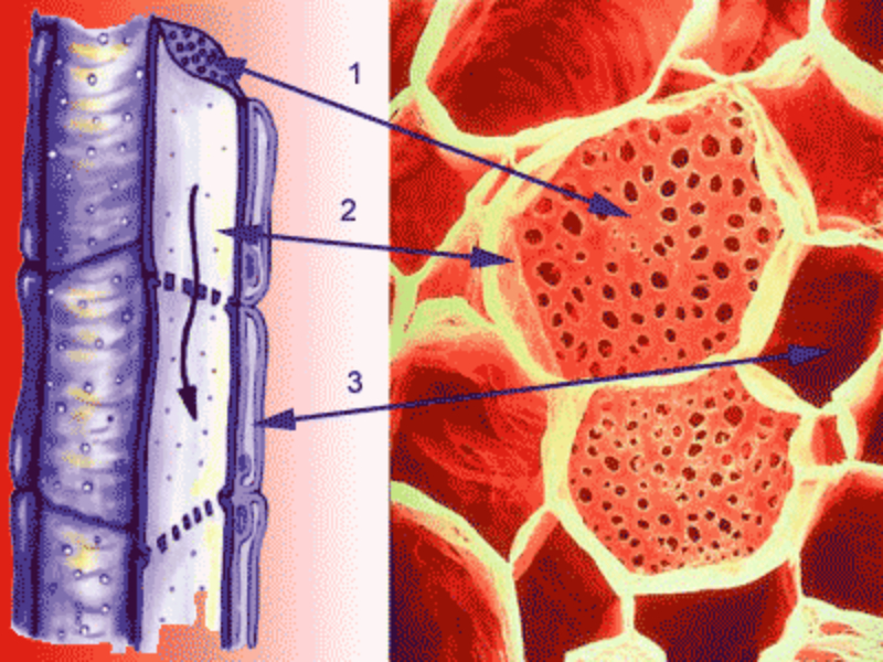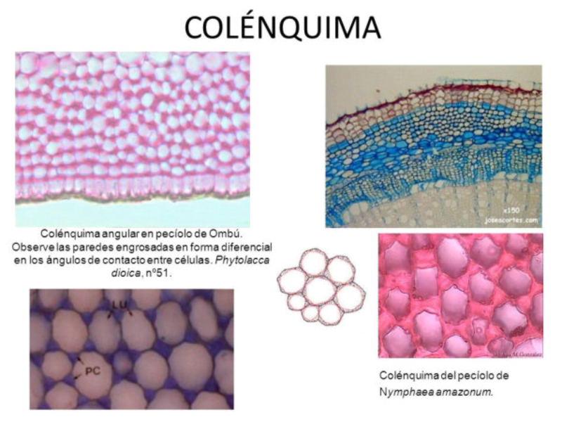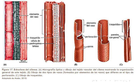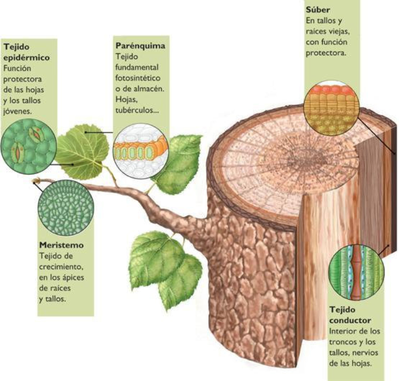 Son tejidos con células diferenciadas y especializadas que, en general, han perdido la capacidad de dividirse. Se clasifican en: secretores, protectores, de sostén, parenquimáticos y conductores o vasculares. 4.2.1. TEJIDOS SECRETORES Elaboran sustancias como esencias, resinas o gomas. Según su posición pueden ser: externos e internos. Tejidos secretores externos: se hallan en la epidermis. Son tricomas glandulares que segregan sales, esencias, néctar, sustancias urticantes o enzimas digestivas (plantas carnívoras ). Tejidos secretores internos: bolsas o canales en el interior de la planta. Tubos laticíferos (secretan látex) y conductos resiníferos, muy abundantes en coníferas (pinos, abetos, cedros…). 4.2.2. TEJIDOS PROTECTORES Recubren los órganos vegetales y los protegen de agentes externos y de la pérdida de agua o nutrientes. Los principales son: epidermis, rizodermis y súber. Epidermis: recubre hojas y tallos jóvenes. Una única capa de células planas, muy unidas, sin cloroplastos y con grandes vacuolas. En su parte externa llevan una cutícula , capa de cera impermeable que impide el paso de agua y gases, obligados a pasar por estructuras especiales, los estomas. Algunas células de la epidermis se convierten en pelos o tricomas, con funciones variadas: aislante térmico, secreción, protección contra animales, etc. Rizodermis: recubre las raíces jóvenes y la zona pilífera en todas las raíces. Forma pelos radicales que absorben agua y sales. Súber: recubre tallo y raíces de plantas adultas. Células muertas, llenas de aire, cuya pared contiene suberina, sustancia protectora que forma el corcho. El súber presenta lenticelas, perforaciones para el intercambio gaseoso. 4.2.3. TEJIDOS DE SOSTÉN Actúan como una especie de esqueleto vegetal gracias a sus células con paredes muy engrosadas. Se hallan en el interior de la planta y pueden ser de dos tipos: colénquima y esclerénquima. Colénquima: sujeción en órganos jóvenes. Tiene células vivas con paredes engrosadas en diferentes puntos, dándoles resistencia, flexibilidad y elasticidad. Forma filamentos en nervios de hojas y superficie de tallos. Esclerénquima: sujeción de órganos adultos. Células muertas, debido a que sus paredes, muy engrosadas, presentan lignina. Tiene dos tipos de células: fibras (a veces usadas como textiles: algodón, lino, cáñamo) y células pétreas o esclereidas (cáscaras de semillas, carne de frutas como las peras). 4.2.4. TEJIDOS PARENQUIMÁTICOS O PARÉNQUIMAS Rellenan espacios entre tejidos y tienen importantes funciones. Junto a los de sostén forman el sistema fundamental. Tienen células vivas, redondeadas, de paredes delgadas, con vacuolas de reserva y muchos plastos. Tienen huecos entre sí que se comunican con estomas y lenticelas para el paso de gases. Según su función se distinguen varios tipos: clorofílico, de reserva, aerífero y acuífero. Parénquima clorofílico o asimilador: en partes verdes de las plantas. Sus células contienen numerosos cloroplastos que realizan fotosíntesis. Especialmente abundante en hojas. En el haz de las hojas las células son prismáticas y muy unidas (parénquima en empalizada). En el envés, son células redondeadas con grandes huecos entre sí (parénquima lagunar). Parénquima de reserva: tienen células sin clorofila, encargadas de almacenar sustancias de reserva para la planta: almidón y otros glúcidos, proteínas, lípidos Se hallan en órganos no expuestos a la luz: raíces, semillas, bulbos, tubérculos Parénquima aerífero: sus células dejan grandes huecos entre sí (meatos) para la circulación del aire o como órgano de flotación en plantas acuáticas. Parénquima acuífero: con células que almacenan agua. Típico de plantas de climas áridos (xerófitas), como las cactáceas. 4.2.5.TEJIDOS CONDUCTORES O VASCULARES Son los más complejos. Transportan savia por toda la planta. Sus células suelen ser alargadas en la dirección del transporte y muchas veces se unen formando tubos conductores largos y finos. Existen dos tipos: xilema y floema. Xilema o leño: con células muertas de paredes engrosadas. Transportan la savia bruta desde las raíces a las partes fotosintéticas y dan soporte a la planta. Tiene varios tipos de células: elementos traqueales (transporte), fibras del xilema (sostén) y células parenquimáticas (almacén). Los elementos traqueales son fibras de células cilíndricas, muertas, con paredes engrosadas de lignina. Existen dos tipos de elementos traqueales: tráqueas y traqueidas: Tráqueas: células unidas en tubos continuos llamados vasos. La pared que comunica dos células adyacentes está perforada o desaparece, facilitando el transporte. Traqueidas: células largas, de extremos afilados, con tabiques transversales oblicuos y con perforaciones. Floema o líber: células vivas. Transporta la savia elaborada desde las partes fotosintéticas al resto de la planta. Consta de varios tipos de células: elementos o tubos cribosos, células acompañantes, fibras de esclerénquima y células parenquimáticas. Los elementos o tubos cribosos se forman por la superposición de células cribosas, células cilíndricas vivas con la pared compartida perforada formando las placas cribosas. Aunque vivas, estas células carecen de núcleo, por lo que para su subsistencia dependen de células acompañantes, que colaboran con ellas. En climas templados, los poros de la placa cribosa quedan obstruidos por un polisacárido llamado calosa, que impide la circulación de la savia. En primavera, la calosa se disuelve y se reinicia la circulación.
