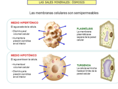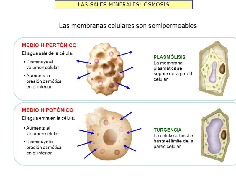 La ósmosis es el paso de agua, a través de una membrana semipermeable (deja pasar el agua pero no el soluto), desde la disolución más diluida a la más concentrada. Presión osmótica sería la presión necesaria para impedir dicho flujo.Este proceso es importante en los seres vivos porque la membrana plasmática es semipermeable. Las células han de estar en equilibrio osmótico con su medio.Las disoluciones con igual concentración de solutos se denominan isotónicas. Una disolución es hipertónica si está más concentrada que otra (hipotónica).El comportamiento osmótico es diferente en células animales y vegetales:Células animales: en medio hipotónico entra agua. Las células se hinchan (turgencia) y pueden estallar (lisis, hemólisis en eritrocitos). En medio hipertónico sale agua: deshidratación y muerte (crenación en eritrocitos).Células vegetales: en medio hipotónico entra agua y se produce la turgencia, pero la pared vegetal impide la lisis. En medio hipertónico sale agua, la membrana se separa de la pared y se rompe (plasmólisis), dando deshidratación y marchitez.
