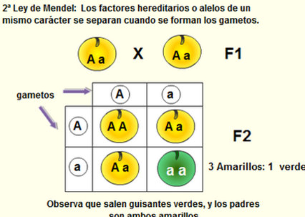 La segunda ley de Mendel o ley de la segregación de los caracteres en la 2ª generación establece que al cruzar dos de los híbridos obtenidos en la primera generación, los caracteres se separan y aparecen en la segunda generación. Los individuos de la F 2 aparecían en proporción 3:1, es decir, 3/4 eran de carácter dominante y 1/4 de carácter recesivo. Esto indica que los individuos de la F 1 son híbridos, pero sólo expresan un carácter, el dominante. Actualmente se interpreta como una separación de cromosomas a la hora de formarse los gametos. Cada alelo va en un cromosoma y acaba en uno sólo de los gametos. Esta ley sólo se cumple en herencia dominante.