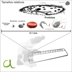 Las bacterias son procariotas; las algas, hongos y protozoos,