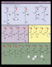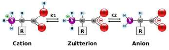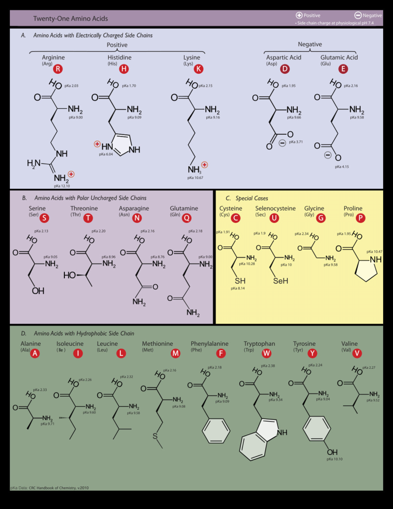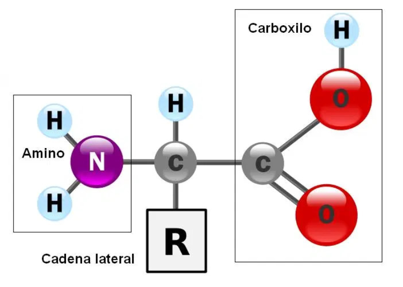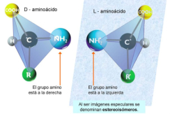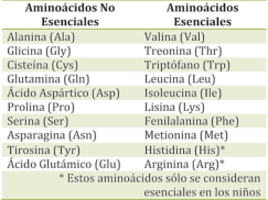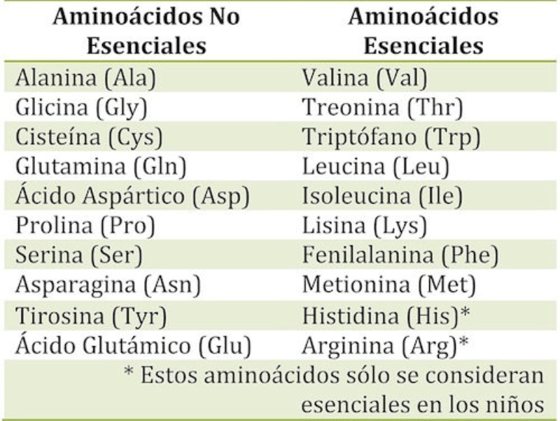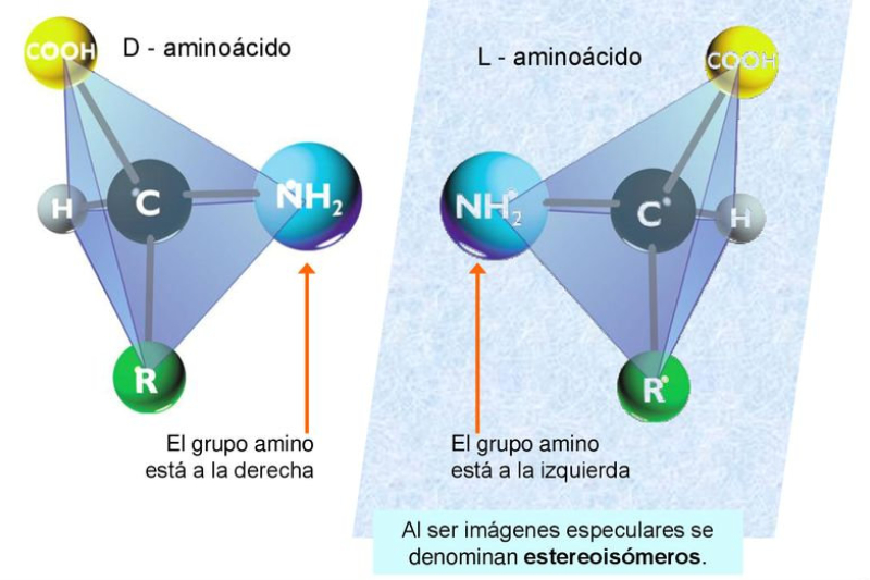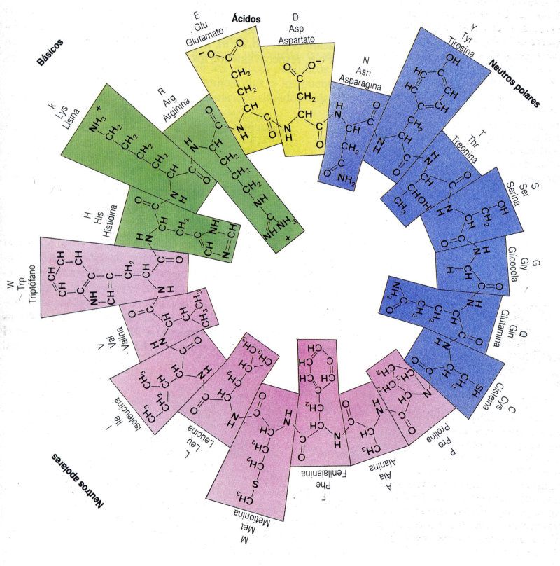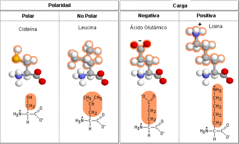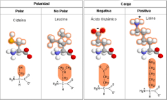 Aunque existen muchos más, en las proteínas sólo se encuentran 20 aa diferentes: los aa proteicos. Están formados por un carbono central (Cα) que se une a un grupo amino (-NH2), un grupo ácido (-COOH), un hidrógeno (-H) y una cadena lateral (R)variable.De los 20 aa, los humanos sólo sintetizan 12 en adultos y 10 en la infancia (y en embarazadas). El resto ha de tomarse con la dieta: aa esenciales (treonina, metionina, lisina, valina, triptófano, leucina, isoleucina y fenilalanina + histidina y arginina). Carnes, huevos y lácteos tienen todos los aa esenciales. También pueden obtenerse combinando legumbres y cereales.Como el Cα es asimétrico (salvo en la glicina), los aa tienen estereoisomería (enantiómeros D y L) y son ópticamente activos (dextrógiros y levógiros). En las proteínas sólo hay aa L (D en bacterias y antibióticos).Son anfóteros, actúan como ácidos y como bases. En disolución, el grupo amino y el ácido (así como algunas cadenas laterales) están ionizados, formas zwitteriónicas.Algunos aa o derivados intervienen en la comunicación celular, como neurotransmisores o como hormonas.4.1.1. CLASIFICACIÓNSe clasifican según la polaridad de las cadenas R laterales: apolares (alifáticos y aromáticos), polares sin carga y polares con carga (ácidos y básicos).Apolares: cadena R con grupos hidrófobos que se unen a otros por fuerzas de Van der Waals. Pueden ser:Alifáticos: R es alifática. Glicina (Gly) G, alanina (Ala) A, valina (Val) V, isoleucina (Ile) I, metionina (Met) M (con azufre), prolina (Pro) P y leucina (Leu) L.Aromáticos: R con anillos aromáticos. Fenilalanina (Phe) F y triptófano (Trp) W.Polares sin carga: R con grupos polares que pueden formar puentes de H. Serina (Ser) S, treonina (Thr) T, tirosina (Tyr) Y, cisteína (Cys) C (con S), glutamina (Gln) Q y asparagina (Asn) NPolares con carga ácidos: R tiene grupos carboxilo (aniones). Ácido aspártico (aspartato) (Asp) D y ácido glutámico (glutamato) (Glu) E.Polares con carga básicos: R tiene grupos amino (cationes). Lisina (Lys) K, arginina (Arg) R e histidina (His) H.
