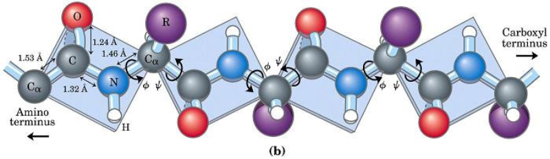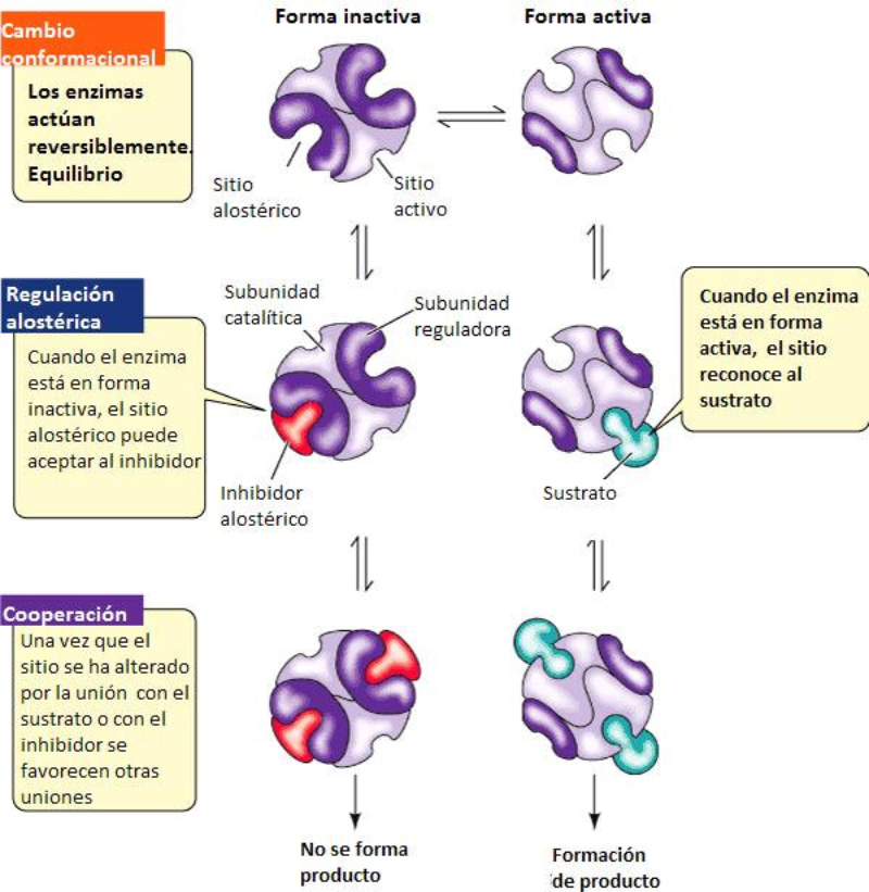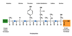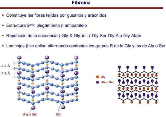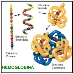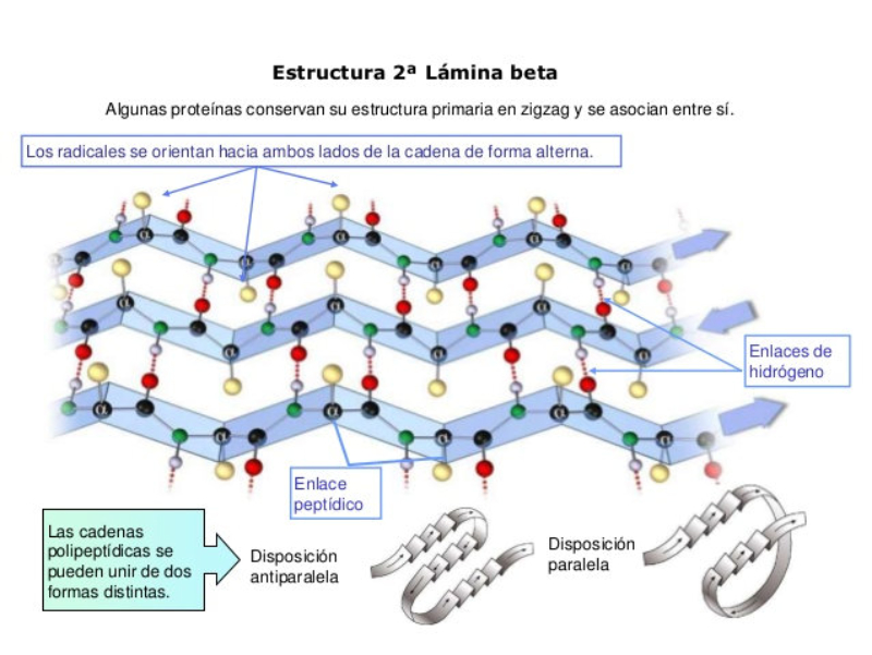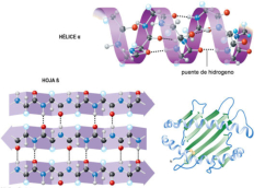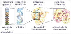 La funcionalidad de las proteínas depende de su estructura tridimensional o espacial, la cual presenta cuatro niveles de organización: estructuras primaria, secundaria, terciaria y cuaternaria.4.2.1. ESTRUCTURA PRIMARIAEs la formada por la secuencia de aa. Los aa se unen por enlace peptídico, unión entre el amino de un aa y el carboxilo de otro, con pérdida de H2O. Se forma así un péptido: dipéptido, tripéptido,…, polipéptido.Péptido (<10 aa); polipéptido (<100 aa); proteína (>100 aa). (La mayor proteína conocida es la titina o conectina, implicada en la contracción muscular y que, en humanos, tiene 34.350 aa, pesa 3.816.188,13 Da, su fórmula empírica es C169 723H270 464N45 688O52 243S912. El nombre oficial completo dado por la IUPAC a esta proteína en humanos, que comienza por methionyl... y termina por ...isoleucine, contiene 189,819 letras y podría considerarse la palabra más larga del mundo en cualquier idioma).Toda cadena peptídica tiene un extremo amino (N-terminal) y otro carboxilo (C-terminal). Se considera que la cadena empieza en el N-terminal y acaba en el C-terminal. Su esqueleto común es la secuencia repetida de 6 átomos: -NH-CH-CO- y difieren en la cadena lateral R.La estructura primaria viene así definida por el número, tipo y secuencia de los aa.Las cadenas peptídicas pueden rotar alrededor de los enlaces C-Cα y N-Cα, pero no alrededor del enlace peptídico, que tiene carácter de doble enlace. Por ello, los átomos del enlace peptídico están en un mismo plano y le da a la cadena un aspecto de placas planas articuladas.4.2.2. ESTRUCTURA SECUNDARIAA medida que la cadena polipeptídica se sintetiza en los ribosomas, se va plegando para adquirir la estructura tridimensional más estable. Es este plegamiento intervienen proteínas llamadas chaperonas.La estructura secundaria es la conformación espacial de la cadena polipeptídica, unida por puentes de H entre los grupos –C=O de unos enlaces peptídicos y los –NH de otros enlaces.La estructura secundaria puede tomar una forma irregular (enroscamientos aleatorios), pero habitualmente adopta una de dos estructuras: α-hélice o β-laminar. 4.2.2.1. Conformación α-héliceLa sucesión de aa de la estructura primaria se enrolla sobre sí misma en forma de hélice. Como las cadenas R no intervienen en los enlaces, esta conformación puede adoptarse por proteínas muy diferentes.Algunos aa desestabilizan la hélice debido a su tamaño, sus cargas o su estructura (prolina: su amina es secundaria).4.2.2.2. Conformación β-laminarLa cadena polipeptídica queda extendida y se pliega sobre sí misma, con fragmentos paralelos y antiparalelos enfrentados y unidos por puentes de H. Queda una lámina plegada en zigzag.En ciertas proteínas, como la fibroína de la seda, puede haber, además, puentes de H entre cadenas diferentes.4.2.2.3. Hélice de colágenoEs una variedad de estructura secundaria. Consiste en tres hélices levógiras enrolladas entre sí. Se produce por el gran número de aa prolina. 4.2.3. ESTRUCTURA TERCIARIAEstructura espacial definitiva de la proteína con regiones en α-hélice y β-laminar mezcladas. La estructura se mantiene por enlaces débiles: puentes de H, fuerzas electrostáticas, fuerzas de Van der Waals y, en algunos casos, puentes disulfuro. El resultado puede ser:Proteínas fibrosas o filamentosas: estructura simple, alargada, resistente e insoluble. Las cadenas R tienen pocos grupos polares y apenas intervienen. Colágeno, queratina, fibroína.Proteínas globulares: esferoidales, compactas y solubles. Como suelen estar en disolución, las cadenas laterales hidrófobas se sitúan al interior de la proteína (láminas β) y las polares al exterior, en contacto con el agua (hélices α). En las proteínas de las membranas, el ambiente es lipídico y la disposición, inversa. 4.2.4. ESTRUCTURA CUATERNARIAConsiste en la asociación de varias cadenas polipeptídicas para formar una proteína compleja. La unión entre cadenas se da por los mismos enlaces que en la terciaria.En proteínas fibrilares se forman complejos supramoleculares con forma alargada y función estructural: queratina, colágeno.En proteínas globulares la estructura cuaternaria la forman proteínas con estructura terciaria compleja. Las cadenas polipeptídicas se autoensamblan en la célula, formando dímeros (citocromo c), tetrámeros (hemoglobina) y, en general, oligómeros y polímeros(actina y miosina, microtúbulos, ribosomas, cápsida de virus, etc). Estructura 4ria y funcionalidad: la estructura 4ria (o 3ria en las que no tienen 4ria) es responsable de su actividad biológica. Dado que, en última instancia, toda estructura depende de la secuencia de aa, cualquier cambio en esta puede afectar a la funcionalidad.De las casi infinitas posibles proteínas existentes, las actuales son las que probaron ser útiles para las funciones celulares y la evolución las mantuvo, eliminando a las menos eficaces.Alosterismo: algunas proteínas presentan dos tipos de estructura espacial, un estado activo y otro inactivo, debido a cambios conformacionales en respuesta a cambios de pH o de temperatura.Las proteínas alostéricas presentan esos estados, pero gracias a la unión con moléculas llamadas ligandos, que modifican su estructura espacial.El alosterismo es uno de los mecanismos más eficaces para regular la función de una proteína, activándola o inactivándola según las necesidades.