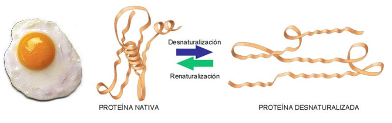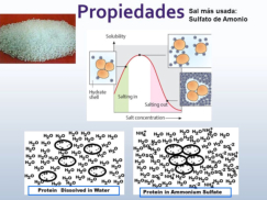 Las propiedades físicas y químicas de las proteínas dependen en última instancia de la secuencia de aa, ya que serán las cadenas R las que determinen la estructura tridimensional y la funcionalidad.4.3.1. ESPECIFICIDADLas proteínas presentan una superficie o centro activo, formado por grupos funcionales de algunas cadenas laterales R de su superficie que les permite interaccionar con otras moléculas. El resto de la proteína tiene como función mantener la forma apropiada para que la superficie activa esté en posición correcta.La actividad biológica de las proteínas se basa en la unión selectivadel centro activo con moléculas que encajan perfectamente en él. Pueden ser moléculas iguales (otras proteínas) o diferentes(anticuerpo-antígeno, hemoglobina-oxígeno, enzima-sustrato, receptores de membrana-mensajero).Esta característica de unión selectiva se llama especificidad y depende de la secuencia de aa. Cualquier cambio en esta secuencia alterará la estructura tridimensional de la proteína y su funcionalidad (como en la anemia falciforme).4.3.2. SOLUBILIDADLas proteínas globulares son solubles debido a sus cargas, que atraen al agua, formando una capa de solvatación. La presencia de sales como el sulfato de amonio ((NH4)2SO4) en gran cantidad provoca la precipitación de las proteínas al competir los iones NH4+ y SO4- por el agua.4.3.3. DESNATURALIZACIÓNEs la pérdida de la conformación espacial, que conlleva la pérdida de funcionalidad. Se produce en condiciones desfavorables (temperatura, pH, iones, agentes químicos, presión, electricidad…). Las proteínas se convierten en filamentos fibrosos insolubles (huevo cocido, melanina en el gato siamés).Si las condiciones desfavorables duran poco tiempo o son poco intensas, la desnaturalización puede ser reversible y la proteína recuperar su estructura y función (renaturalización). En otros casos es irreversible.