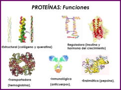 Reserva: no suelen ser combustibles. Ovoalbúmina, caseína.Estructural: una función típica. Glucoproteínas (membranas). Huso acromático y citoesqueleto. Histonas (estructura y regulación del ADN). Colágeno (tejido conjuntivo: relleno, cartílago, tendones…)Homeostática: actúan como tampones o sistemas buffer,regulando el pH.Portadoras de mensajes: hormonas (insulina, glucagón, hormona del crecimiento, oxitocina, vasopresina…). Neurotransmisores: endorfinas y encefalinas.Recepción y transmisión de señales: actúan como receptores de membrana. Se unen a una molécula portadora de un mensaje (neurotransmisor, hormona,…) y sufren un cambio conformacional que es una señal para provocar una respuesta (apertura de canales iónicos, estimulación de mitosis, incremento de síntesis de proteínas…). Las señales pasan de las membranas al citoplasma por un sistema de transducción de señales mediante proteínas alostéricas que sufren activación en cascada.Transporte: transporte a través de membranas (proteínas de canal); oxígeno (hemoglobina, hemocianina, mioglobina); electrones (citocromos en respiración y fotosíntesis); lípidos, fármacos y tóxicos (seroalbúmina).Destacan las lipoproteínas plasmáticas, que transportan lípidos en sangre:Quilomicrones: transportan triacilglicéridos y colesterol de la dieta, desde intestino a hígado.VLDL y LDL: transportan triacilglicéridos y colesterol sintetizados desde el hígado a los tejidos (“colesterol malo”).HDL: transportan colesterol desde tejidos al hígado (“colesterol bueno”).Defensa: coagulación (trombina y fibrinógeno); germicidas (proteoglucanos o mucinas); anticuerpos (inmunoglobulinas).Contráctil: son los motores moleculares, proteínas que se desplazan unidireccionalmente por el citoesqueleto. Transportan orgánulos, vesículas; mueven a las células (dineína de cilios y flagelos; actina y miosina en músculos).Enzimática: quizá la más importante. Las más numerosas y especializadas. Son biocatalizadores del metabolismo. Son específicas de las reacciones y sustratos que catalizan. La vida depende de la actividad catalítica, que acelera las reacciones químicas.