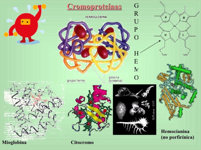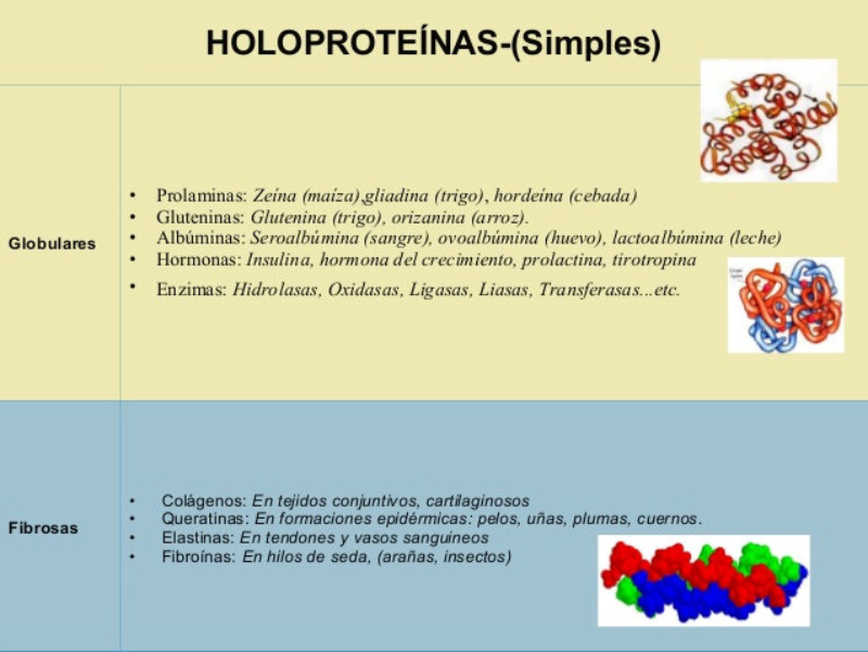 4.4.1. HOLOPROTEÍNASFormadas sólo por aa. Pueden ser:Globulares: esféricas y solubles.Albúminas: función de reserva y transporte (ovoalbúmina, lactoalbúmina y seroalbúmina).Globulinas: incluyen las α y β globulinas (hemoglobina), y las γ-globulinas de los anticuerpos.Histonas y protaminas: unidas a los ácidos nucleicos.Fibrosas o escleroproteínas: insolubles, estructurales: colágeno, queratina, elastina, fibroína.4.4.2. HETEROPROTEÍNAS O PROTEÍNAS CONJUGADASLlevan un grupo proteico y una parte no proteica (grupo prostético).Glucoproteínas: glucoconjugados. Proteínas de membrana, hormonas, …Lipoproteínas: proteínas sanguíneas que transportan triglicéridos, colesterol y otros lípidos.Cromoproteínas: el grupo prostético es una sustancia coloreada.De naturaleza porfirínica: llevan porfirina(con anillos tetrapirrólicos). Grupo hemo de hemoglobinas, con Fe.De naturaleza no porfirínica: Sin porfirina. Hemocianina (con Cu) y hemeritrina (con Fe) en sangre de invertebrados.Otras heteroproteínas: fosfoproteínas (con ácido fosfórico: caseína) y nucleoproteínas (cromatina: ADN + histonas y protaminas).