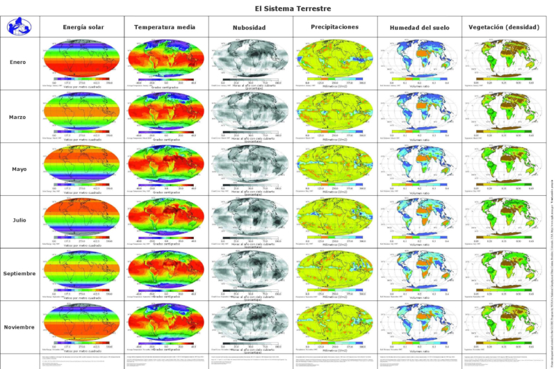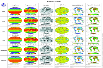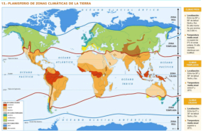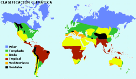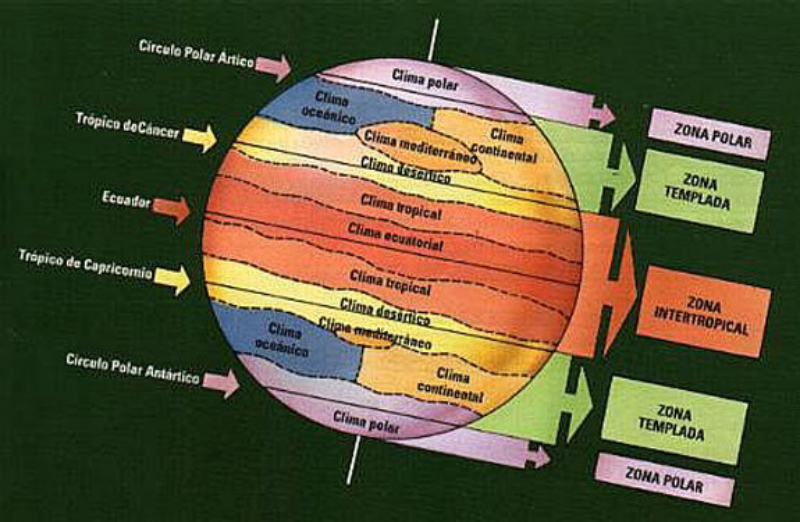 El clima determina la distribución y abundancia de los vegetales y, por tanto, la del resto de los seres vivos.En la Tierra existe una gran variedad de climas, que vienen determinados por dos factores:•La temperatura: la temperatura de nuestro planeta aumenta desde los polos hasta el ecuador. Así, se pueden establecer tres zonas climáticas:oZona fría o polar: desde los polos hasta los círculos polares.oZona templada: entre los círculos polares y los trópico de Cáncer y Capricornio.oZona cálida o intertropical: entre los dos trópicos.•Las precipitaciones: dependen de la circulación de las masas de aire en la atmósfera. Estas masas de aire pueden llevar grandes cantidades de agua o ser muy secas. Hay zonas de la Tierra casi sin precipitaciones (desiertos) y otras con más de 2.500 mm al año (zona ecuatorial). Además, las precipitaciones pueden ser homogéneas a lo largo del año o muy irregulares.