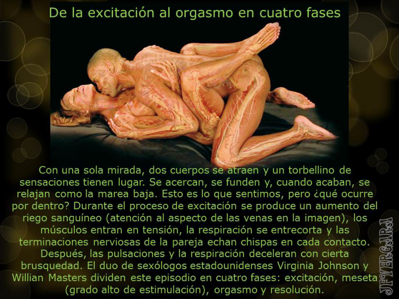 El acto sexual o relación sexual suele transcurrir siguiendo varias fases.Deseo sexual: en respuesta a variados estímulos e influido por factores culturales y personales. Se debe al instinto sexual, innato, que impulsa a la reproducción.Excitación: ante estímulos mentales, visuales, táctiles, olfativos..., tales como caricias, besos, palabras.Respuesta sexual: es independiente del tipo de conducta sexual (masturbación, homosexual, heterosexual,...). Los capilares sanguíneos se dilatan, dando rubor, erección del pene y del clítoris. Se aceleran el ritmo cardíaco y la respiración.Penetración: al entrar en erección, el pene gana en tamaño y rigidez. La vagina produce secreciones que facilitan la introducción del pene y el movimiento en su interior.Orgasmo: el placer va en aumento hasta llegar a un máximo, el orgasmo, con contracciones de los órganos sexuales.En la mujer las contracciones se dan en la vagina y útero.En el hombre se produce la eyaculación, expulsando el semen al interior de la vagina.Tras el orgasmo se pierde la erección y el cuerpo recupera su estado normal en poco tiempo.