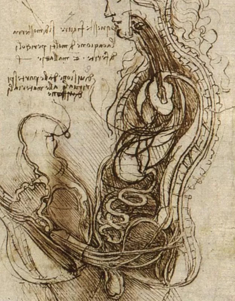 Dibujo de Leonardo Da Vinci de una pareja teniendo relaciones sexuales.Aparecen dos canales dentro del pene, aunque realmente sólo hay uno. Según Da Vinci, el de abajo llevaba la orina y el de arriba, el semen. Este último estaba conectado con la columna espinal y el cerebro.Cuando dibujó la anatomía de la mujer, no le puso ovarios pero sí un tubo que conectaba el útero con los pezones, algo que sólo existe en la imaginación del renacentista italiano. La suposición era que la leche materna era hecha de sangre menstrual refinada y transformada.