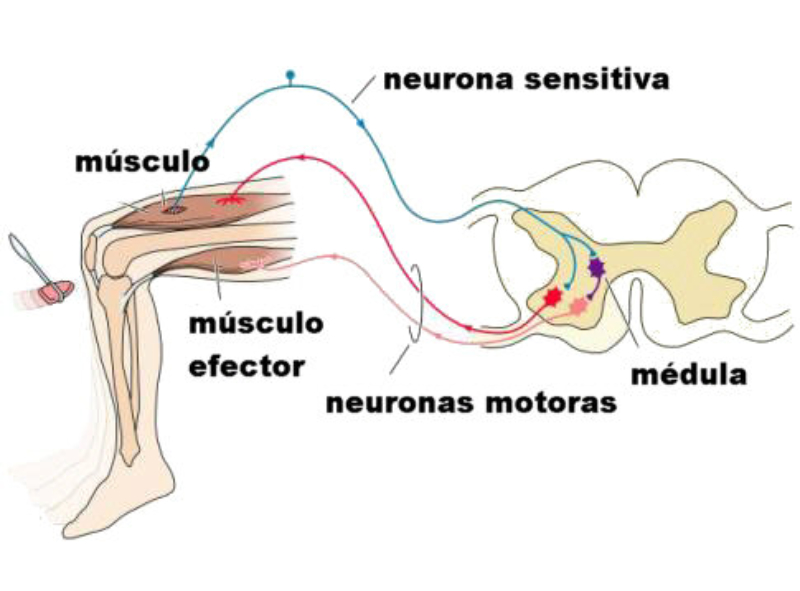 Los actos reflejos son respuestas del SNC que no se producen en el encéfalo, sino en la médula espinal. Allí interviene sólo dos neuronas: una sensitiva y otra motora.Los reflejos son respuestas involuntarias y rápidas, necesarias en situaciones de supervivencia.Algunos ejemplos de actos reflejos son:El reflejo rotuliano.El reflejo de retirada. Apartarse ante un estímulo doloroso: quemadura, pinchazo, etc.El reflejo aquileo: al golpear el tendón de Aquiles se flexiona la planta del pie.El reflejo pupilar: al iluminar un ojo las pupilas de ambos se contraen.