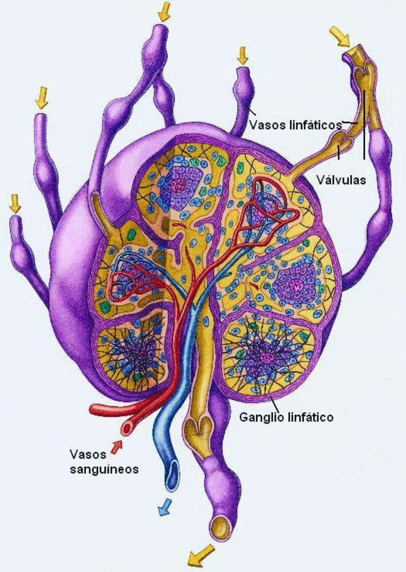 Además del sistema circulatorio sanguíneo existe otro sistema, el linfático, que se encarga de recoger el exceso de líquido que circula entre las células (líquido intersticial) para devolverlo a la sangre. También recoge en el intestino los productos resultantes de la digestión de las grasas.El sistema linfático está constituido por ganglios linfáticos y vasos linfáticos por los que circula un líquido llamado linfa. La linfa tiene prácticamente la misma composición del líquido intersticial y el plasma; si bien su concentración de proteínas es menor que la del plasma.Los capilares linfáticos se unen formando conductos cada vez de mayor diámetro llamados venas linfáticas que desembocan en las venas subclavias.En el trayecto de los vasos linfáticos se interponen los ganglios linfáticos, que actúan como filtros para la linfa. Cuando ésta los atraviesa, los leucocitos que colonizan los ganglios destruyen a los microorganismos. Es por ello que, cuando existe una infección, los ganglios de la zona afectada se inflaman y pueden palparse desde la superficie. En los ganglios linfáticos se forman linfocitos.