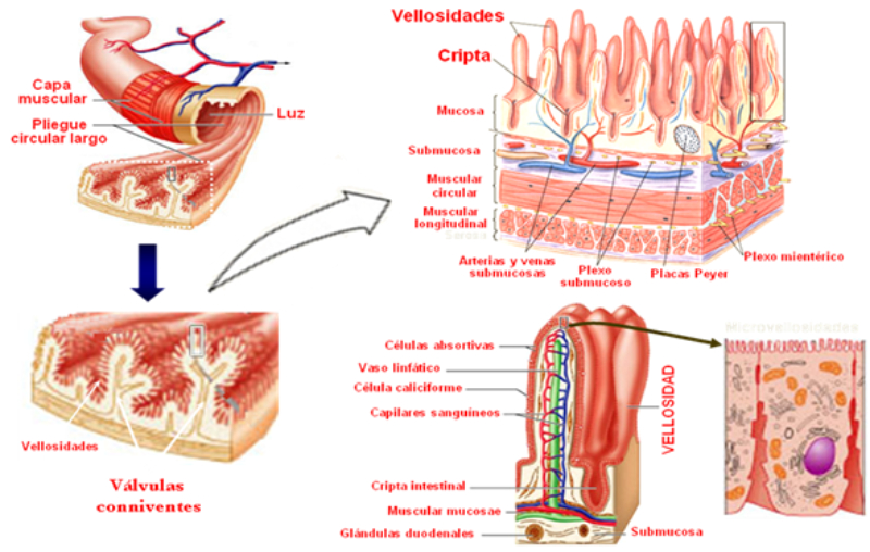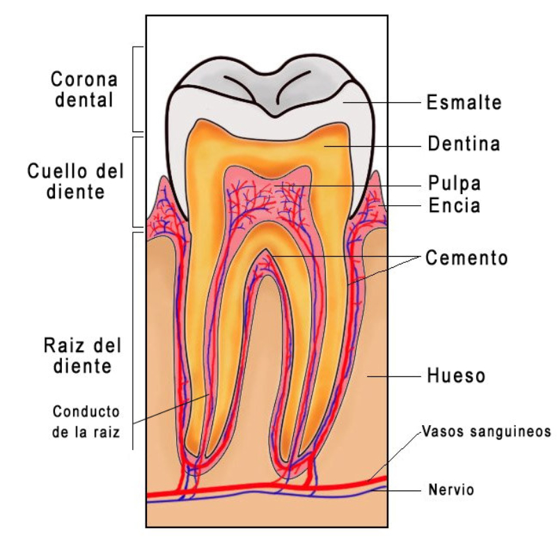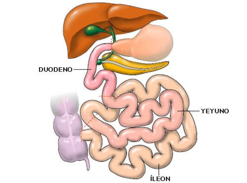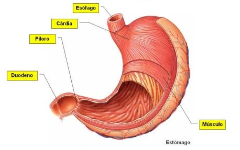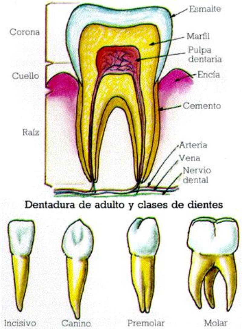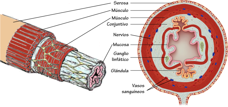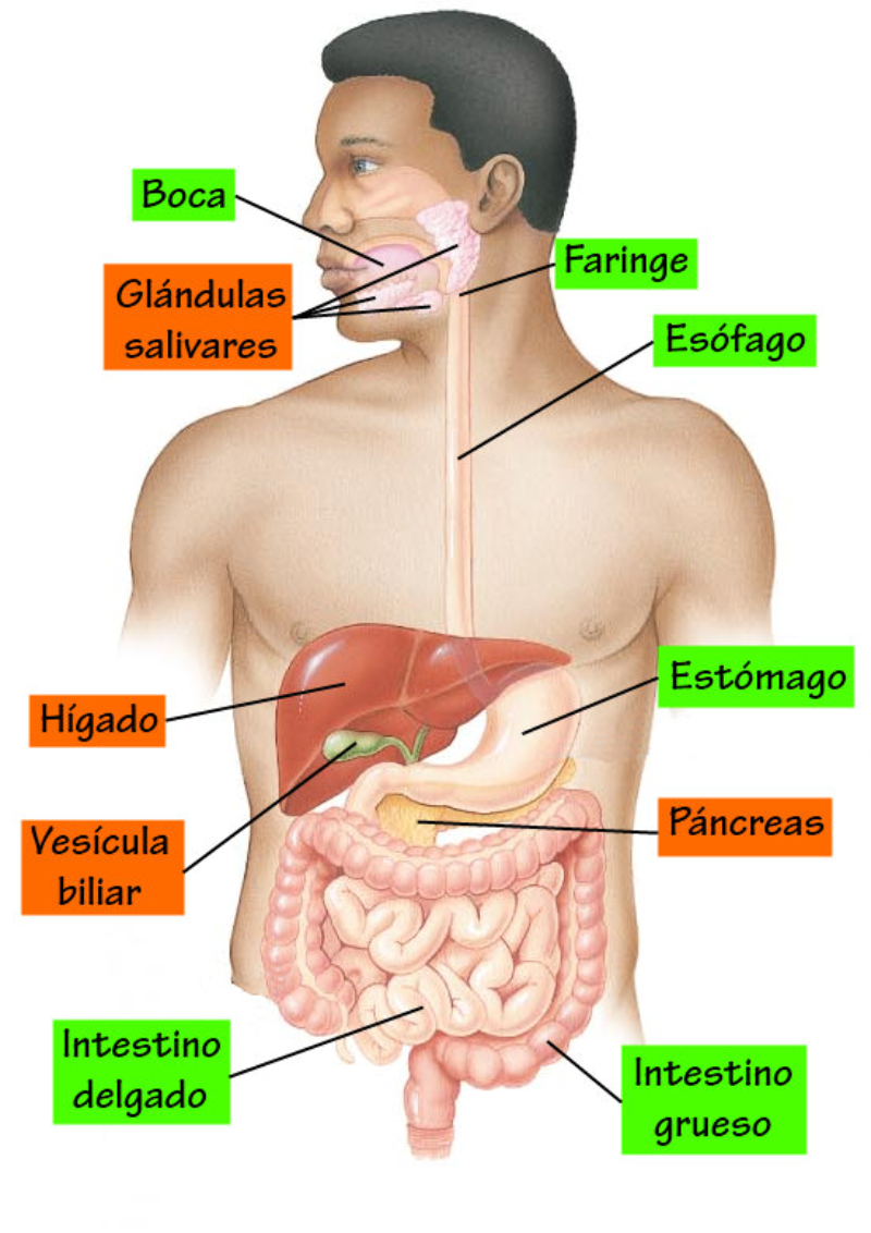 Formado por: boca, faringe, esófago, estómago, intestino delgado, intestino grueso, recto y ano.Su pared está compuesta de 3 capas:•Una capa muscular longitudinal.•Una capa muscular circular.•Una capa interna de tejido epitelial o mucosa, con glándulas que producen mucus y jugos digestivos.Las capas musculares le dan elasticidad y movilidad (peristalsis).LA BOCAOrificio de entrada al digestivo. Cerrada por los labios. En su interior está la lengua, órgano muscular que ayuda a la masticación, deglución y percepción de sabores.La boca se comunica con la faringe o garganta, común a digestivo y respiratorio.DIENTESLos dientes son las partes más duras del cuerpo humano. Se encuentran alojados en cavidades de la mandíbula llamadas alveolos y unidos a las encías. Un diente tiene las siguientes partes:Existen cuatro tipos de dientes:Incisivos: (paletas). Corona plana y afilada. Sirven para cortar los alimentos.Caninos: con corona puntiaguda. Para desgarrar.Premolares: de corona ancha y aplanada. Para aplastar y triturarMolares: de igual forma y función que los premolares, pero mayores y con 3 raíces.Los humanos tienen dos denticiones. La primera aparece a los 6 meses y dura hasta los 6 años. Consta de 20 dientes (todos menos los molares). Es la llamada dentición de leche. La 2ª aparece a partir de los 6 años, sustituyendo a la anterior y añadiendo los molares, con lo que consta de 32 dientes. Es la dentición definitiva.FARINGEGarganta. Cavidad común al digestivo y al respiratorio.ESÓFAGOTubo de 25 cm. Conecta la boca y el estómago, atravesando el diafragma. Se halla entre la tráquea y la columna vertebral.ESTÓMAGOÓrgano en forma de saco. Capacidad de litro y medio. Tiene un orifico de entrada (cardias), comunicado con el esófago y controlado por un esfínter (músculo circular) y otro de salida (píloro), que lo comunica con el intestino delgado gracias a otro esfínter.La pared interna tiene una mucosa protectora y glándulas que fabrican el jugo gástrico. El estómago almacena el alimento y lo digiere en parte, controlando su paso al intestino.INTESTINO DELGADOTubo largo y delgado, de unos 5 metros, por lo que se halla enrollado en el abdomen. Se divide en tres partes:Duodeno: primer tramo. Unos 25 cm. A él vierten los conductos biliares y pancreáticos.Yeyuno: parte media. En él se da principalmente la absorción.Íleon: porción final, y más larga, del intestino, donde se acaban de absorber los nutrientes. Desemboca en el intestino grueso por la válvula ileocecal.La pared del intestino delgado está muy plegada para aumentar su superficie de absorción. Además, estos pliegues presentan otros menores con forma de dedo llamados vellosidades, cuyas células tienen repliegues de la membrana denominados microvellosidades. De esta forma se consigue una superficie total de varios m2.INTESTINO GRUESOTubo más grueso y corto que el intestino delgado. Mide 1,5 m y unos 10 cm de grosor. Se divide en:Ciego: primera porción, con forma de fondo de saco y con una prolongación de unos 7 cm llamada apéndice vermiforme.Colon: parte más larga, con forma de ‘U’ invertida. presenta una porción ascendente, una transversa y una descendente.Recto: última porción. Acumula las heces antes de su salida al exterior.ANOOrificio de salida del digestivo, situado al final del recto, y controlado por el esfínter anal. A través de él se expulsan las heces al exterior.