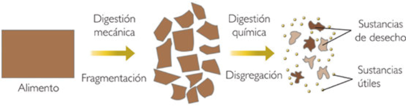La mayoría de los alimentos que tomamos están compuestos de grandes moléculas que nuestro organismo no puede asimilar directamente. Por ello deben ser procesados y convertidos en nutrientes, sustancias que las células pueden absorber. La transformación de los alimentos en nutrientes se lleva a cabo en el aparato digestivo mediante un proceso llamado digestión.La digestión puede ser de dos tipos:•Mecánica: consiste en la trituración del alimento (boca y estómago).•Química: descomposición de las grandes moléculas del alimento en otras más sencillas.
