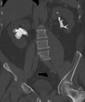 Cuatro imágenes de cálculos renales coraliformes.