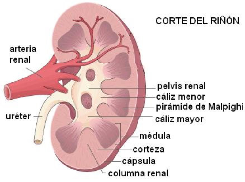 una zona por donde la orina drena hacia un cáliz, y de allí a la