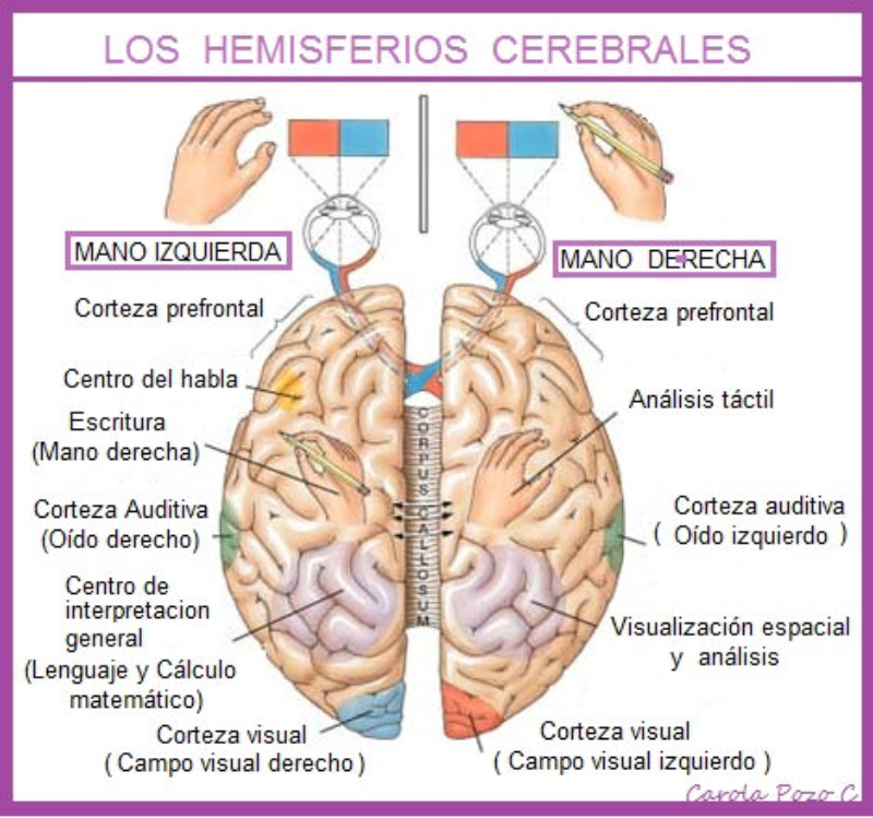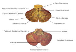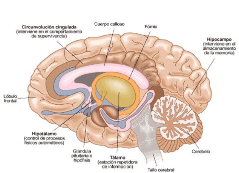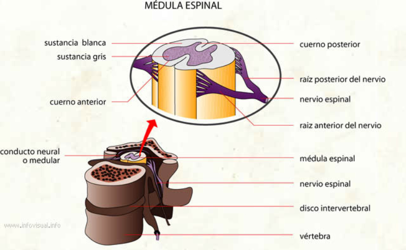 Está formado por el encéfalo (cerebro, cerebelo y bulbo raquídeo) y la médula espinal.A1. EL CEREBROEs la parte más voluminosa (unos 1.500 cc). Recibe los estímulos de los órganos sensoriales, los interpreta y elabora respuestas adecuadas. Además, es el responsable de la consciencia, la capacidad de reconocerse a uno mismo y a sus actos, y de los actos voluntarios.También en el cerebro radican funciones como el lenguaje, la memoria, la creatividad, el pensamiento, el aprendizaje...El cerebro se compone de dos hemisferios cerebrales(derecho e izquierdo), unidos por muchas conexiones. En su superficie presenta pliegues llamados circunvoluciones y surcos, que aumentan su superficie y lo dividen en lóbulos.Bajo los hemisferios cerebrales hay numerosas estructuras: tálamo, hipotálamo, sistema límbico, hipófisis...La parte externa del cerebro es la corteza cerebral, de unos 2 mm de espesor y formada por cuerpos celulares (sustancia gris). Bajo ella hay numerosos axones mielinizados (sustancia blanca).Los pliegues de la corteza cerebral están relacionados con la inteligencia de nuestra especie.Cada región de la corteza se especializa en una función determinada (vista, olfato, oído,...). Además, cuenta con áreas de asociación que integran los diferentes estímulos.A2. EL CEREBELOSe halla bajo el cerebro, parcialmente oculto. Tiene color gris pues su estructura es similar a la del cerebro.Se encarga básicamente de movimientos automáticos: postura y equilibrio, caminar, conducir, montar en bicicleta,...A3. BULBO RAQUÍDEOSe encuentra en la base del cerebro y se continúa con la médula espinal. Es de color blanco, pues la sustancia gris está en el interior y la blanca en el exterior, al contrario que en el cerebro.En su parte inferior muchas de las fibras nerviosas del lado izquierdo se cruzan al derecho y viceversa. Por ello, cada hemisferio cerebral controla básicamente el lado contrario del cuerpo.El bulbo controla funciones vitales como la respiración, el ritmo cardíaco o la digestión.A4. LA MÉDULA ESPINALEs un órgano en forma de cordón, de unos 45 cm de longitud, alojada dentro de la columna vertebral.Su estructura es como la del bulbo raquídeo, con la sustancia gris en el interior. Esta sustancia tiene forma de ‘H’.La médula espinal:Transmite información: desde todo el cuerpo hasta el encéfalo y viceversa.Es responsable de los actos reflejos: respuestas rápidas a estímulos sin que intervenga el cerebro.
