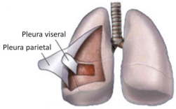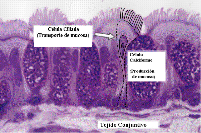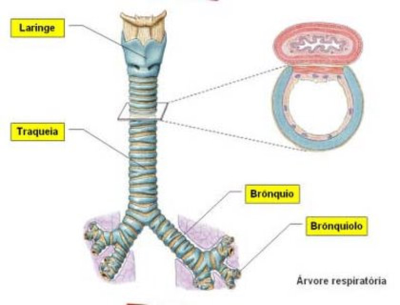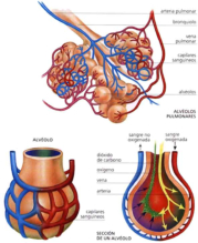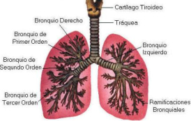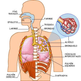 El aparato respiratorio se encarga de captar oxígeno y expulsar CO2. Está formado por los pulmones y las vías respiratorias.VÍAS RESPIRATORIASFosas nasales:son las cavidades de entrada y salida del aire. Están recubiertas por la pituitaria, una membrana muy irrigada. La función de las fosas nasales es limpiar, calentar y humedecer el aire.Faringe: es la garganta, cavidad común al digestivo.Laringe: estructura cartilaginosa que contiene las cuerdas vocales, que emiten sonidos al vibrar. Forma la nuez o bocado de Adán.En su parte superior tiene una prolongación, la epiglotis, que tapona la tráquea al tragar para evitar que los alimentos vayan al respiratorio.Tráquea: tubo de unos 12 cm de longitud, por delante del esófago. Presenta anillos cartilaginosos para mantenerla abierta constantemente. Los anillos son abiertos por detrás para facilitar el paso de los alimentos por el esófago. Al llegar a los pulmones se ramifica en dos bronquios.Bronquios: ramas en que se divide la tráquea. Tienen anillos cartilaginosos para mantenerlos abiertos. Penetran en los pulmones y se ramifican repetidamente en ramas menores llamadas bronquiolos.Bronquiolos: tubos finos, sin cartílagos, que se ramifican por el interior de los pulmones. Acaban en sacos membranosos llamados sacos aéreos.Para su limpieza constante, las vías respiratorias están cubiertas por tejido epitelial con dos tipos de células: ciliadas y secretoras.Células ciliadas: células alargadas con el extremo superior cubierto de prolongaciones llamadas cilios. Éstos se mueven constantemente y empujan al moco hacia la garganta.Células secretoras: fabrican el moco que recubre las vías respiratorias. Este moco humedece el aire y atrapa microorganismos y partículas extrañas que entren en las vías respiratorias. Gracias a los cilios, dichas sustancias extrañas terminan en el estómago.Cuando hay un exceso de moco o funcionan mal los cilios (fumadores) se produce la tos, que expulsa el aire a gran velocidad para eliminar la obstrucción mucosa. El estornudo tiene una función similar.LOS PULMONESSon dos órganos elásticos y esponjosos de color rosado.El pulmón derecho es mayor y presentan tres porciones o lóbulos. El izquierdo sólo tiene dos lóbulos y es menor por tener un hueco para alojar al corazón.Los bronquios, al entrar en los pulmones, se ramifican en tubos cada vez más pequeños llamados bronquiolos. El conjunto de todos los bronquios y bronquiolos forma el árbol bronquial.Los bronquiolos desembocan en sacos ciegos, con forma de racimo y paredes muy delgadas: los sacos aéreos, rodeados de una fina red de capilares.Cada saco está formado por varias cavidades menores llamadas alvéolos. En total hay más de 300 millones de alvéolos, con unos 100 m2 de superficie, donde se produce el intercambio de gases.Los pulmones están formados por los bronquiolos, los alvéolos, los vasos sanguíneos y el tejido que rellena los huecos entre ellos.LA CAJA TORÁCICALa caja torácica está formada por la columna vertebral, el esternón, las costillas y el diafragma. Se encarga de proteger a los pulmones y al corazón, además de colaborar en los movimientos respiratorios.El diafragma es un músculo plano situado bajo la caja torácica, cerrándola herméticamente. Está atravesado por el esófago, la aorta y la vena cava inferior.Entre los pulmones y la caja torácica hay dos membranas llamadas pleuras:La pleura interna: en contacto con los pulmones.La pleura externa: en contacto con la caja.En medio de las pleuras hay un espacio lleno de líquido pleural lubricante y amortiguador.