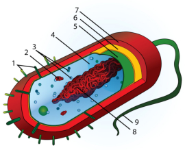 La célula procariota (del griego πρό-(pro-) "antes de" + καρυόν (cariot) "nuez o núcleo") es la más primitiva, es decir, la primera que apareció en la Tierra. Presenta una estructura muy sencilla, aunque funcionalmente pueden ser muy complejas. Como su nombre indica, carece de núcleo verdadero, es decir, rodeado de membranas, y también carece de otros orgánulos membranosos. El único orgánulo en el citoplasma son los ribosomas. Casi siempre están rodeadas por una pared de composición exclusiva en estas células (péptidoglucano). El ADN es una única molécula circular, no rodeada de membranas (procariota). A veces presentan estructuras como una cápsula o flagelos. Sólo las bacterias (Dominios Eubacterias y Arqueobacterias) son procariotas. Todos son unicelulares.
