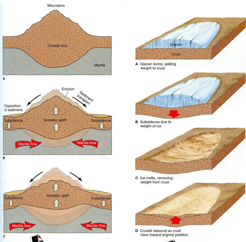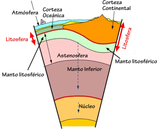 Ocupa la corteza y parte del manto superior. Tiene un espesor de unos 100 km, aunque puede llegar a 250 km. Está a baja temperatura y se comporta como un sólido rígido y frágil. Por ello, no es continua, sino que está fragmentada en trozos llamados placas litosféricas. Las placas litosféricas flotan sobre el manto superior, más plástico, y pueden desplazarse, crearse y destruirse, dando lugar a continentes y océanos, montañas, terremotos, volcanes, … Cerca de la astenosfera, la litosfera puede ser algo dúctil. MOVIMIENTO DE LAS PLACAS LITOSFÉRICAS Las placas litosféricas se mueven tanto en horizontal como en vertical: Movimiento horizontal: las placas se deslizan sobre el manto superior, que es algo plástico. Este movimiento es descrito en la tectónica de placas. Movimiento en vertical: las placas se mueven también en vertical, ascendiendo o descendiendo. El límite inferior de la corteza es más profundo donde hay cordilleras y menor bajo las zonas bajas de los continentes. Esto llevó a pensar que la corteza, que es menos densa, flota sobre el manto, con mayor densidad y deformable (plástico). Donde la corteza es más gruesa se hunde más en el manto y viceversa. El concepto de una corteza en equilibrio con el manto por flotación se denomina isostasia. Si un continente pierde masa y grosor (erosión, deshielo) se eleva para alcanzar el equilibrio. Si aumenta su grosor (elevación de cordilleras, acumulación de hielo), se hunde hasta el equilibrio. La isostasia aún se discute y hay varios modelos, aunque el movimiento vertical de los continentes ha sido confirmado.