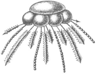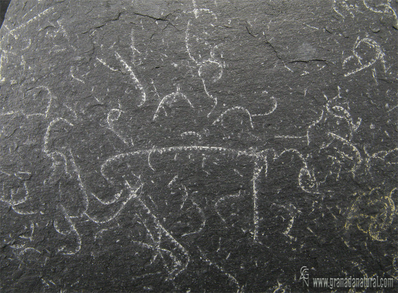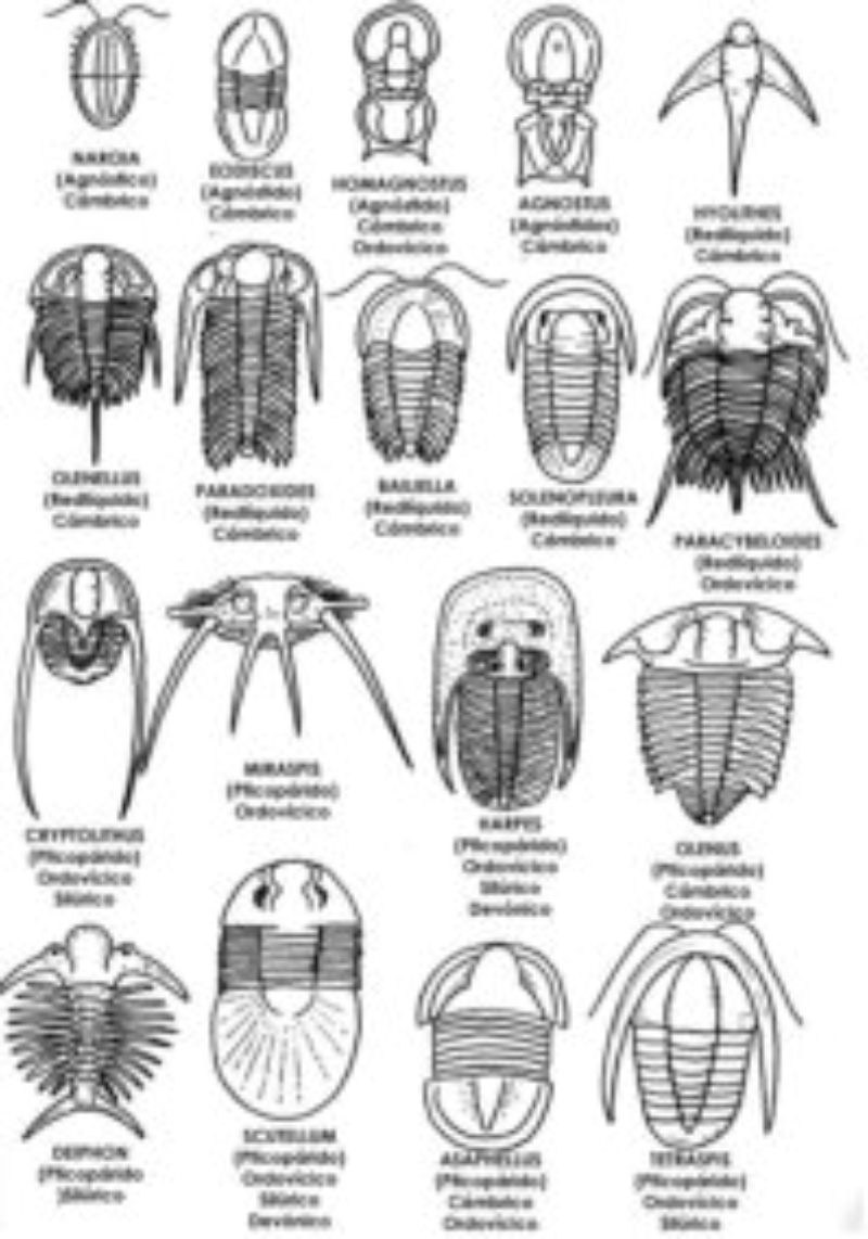 TRILOBITES Artropodos marinos del Paleozoico. Presentaban un caparazón con tres partes: cefalón, tórax y pigidio. El cefalón es semicircular, con una zona central o glabela y dos laterales o mejillas. Sobre las mejillas estaban los ojos compuestos, como los de los insectos. Cada segmento del tórax presentaba un par de apéndices locomotores y con branquias. GRAPTOLITES Del Paleozoico temprano. Marinos, microscópicos y coloniales. Sus fósiles aparecen en pizarras en forma de trazos dentados (rabdosomas). Cada rabdosoma era una colonia y en cada ‘diente’ había un individuo. Podían vivir en los fondos o flotando. AMMONITES Del Mesozoico. Están emparentados con calamares y pulpos actuales. Moluscos cefalópodos marinos con conchas en forma de espiral, con compartimentos internos (cámaras). El animal vivía en la última y mayor de las cámaras. El resto, llenas de líquido y gas, les permitía flotar. En el exterior tienen una línea de sutura (línea de unión de los tabiques de las cámaras, a veces muy compleja) y, en ocasiones, costillas, engrosamientos radiales de la concha. NUMMULITES Animales marinos del Paleógeno. Eran protozoos unicelulares foraminíferos, con pseudópodos para desplazarse y alimentarse. Tenían un caparazón en espiral y con forma de disco, con multitud de cámaras por donde extendía sus pseudópodos. CALAMITES Planta del Carbonífero. Equiseto gigante (hasta 30 metros), con el tronco hueco y con nudos y entrenudos, como las cañas actuales.