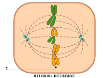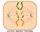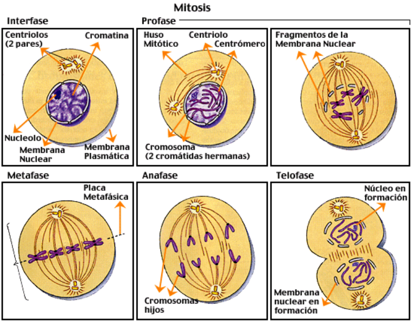 La mitosis es un proceso por el que el núcleo de la célula eucariota se divide en dos núcleos, cada uno conteniendo el mismo número de cromosomas que la célula original.Aunque la mitosis es un proceso continuo, para sus estudio se divide en 4 etapas: profase, metafase, anafase y telofase.PROFASEEl ADN en forma de cromatina comienza a condensarse, formándose los cromosomas y haciéndose visible, al tiempo que desaparece el nucleolo.En células animales los centríolos, duplicados en la fase S de la interfase, comienzan a formar entre ellos una serie de microtúbulos, el huso mitótico. El crecimiento de estos microtúbulos impulsa a cada pareja de centríolos a un polo de la célula. En células vegetales el huso se forma a partir de los centrosomas.La membrana nuclear empieza a desintegrarse y, al final de esta fase, habrá desparecido.METAFASELos cromosomas, arrastrados por los microtúbulos del huso, se disponen en la zona ecuatorial de la célula (placa ecuatorial). Los cromosomas alcanzan el mayor grado de condensación y son visibles las dos cromátidas (copias de ADN en cada cromosoma).ANAFASELos microtúbulos del huso se acortan y tiran de cada cromátida hermana hacia uno de los polos. Los cromosomas (formados por una única cromátida) se denominan cromosomas anafásicos.TELOFASELas cromátidas alcanzan los polos de la célula y comienzan a descondensarse en cromatina. El huso mitótico desaparece y se forman las membranas nucleares de los nuevos núcleos.