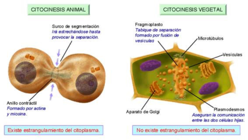 Una vez dividido el núcleo, para completar la división celular debe dividirse el citoplasma y repartir los orgánulos. Este proceso se denomina citocinesis y es diferente en células animales y vegetales.CÉLULA ANIMALLa citocinesis se produce por la aparición de un anillo contráctil en mitad de la célula. El anillo se estrecha y se da un estrangulamiento celular hasta que queda dividida en dos.CÉLULA VEGETALLa presencia de una pared rígida impide el estrangulamiento. Para separar a las células hijas, en el centro de la célula se acumulan vesículas producidas en el aparato de Golgi. Estas vesículas vierten los componentes de la nueva pared, formando un tabique que separará a las células hijas.