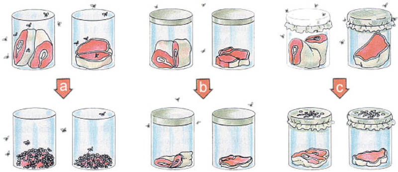 La generación espontánea es la teoría que postulaba que la vida puede aparecer a partir de la materia inerte. Las larvas aparecían de la carne, la madera o los excrementos en descomposición (Aristóteles). Paracelso (médico del s. XVI) creía que los espermatozoides eran humúnculos, organismos en miniatura que sólo tenían que crecer para convertirse en adultos... Francisco Redi, en el siglo XVII, demostró que las larvas de la carne aparecían por los huevos de los insectos. Lázaro Spallanzani, en el XVII, hizo lo propio con los microorganismos, aunque no pudo refutar del todo la generación espontánea. Finalmente, en el s. XIX, Louis Pasteur demostró definitivamente la imposibilidad de que los microorganismos se desarrollen si no es a partir de otros.