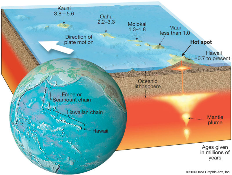Aunque la mayoría de la actividad volcánica se concentra en los bordes de las placas, existen excepciones.Un caso especial es el de las islas Hawái.Las Hawái forman una cadena de islas volcánicas que comienzan en Hawái y se dirigen hacia el noroeste, para luego continuar hacia el norte formando montes submarinos llamados montes Emperador, con volcanes extinguidos.Sólo la isla de Hawái tiene volcanes activos y es la isla más joven. La edad aumenta con la distancia a esta isla. La más antigua de las islas Hawái tiene unos 5 millones de años. La más antigua de las Emperador, unos 65 millones.La existencia de estas islas se debe a un punto caliente en el Pacífico. El punto permanece inmóvil, pero las islas se desplazan con la placa Pacífica, por lo que continuamente se forman nuevos volcanes.Las Islas Canarias tuvieron un origen similar, aunque su movimiento es más complejo.