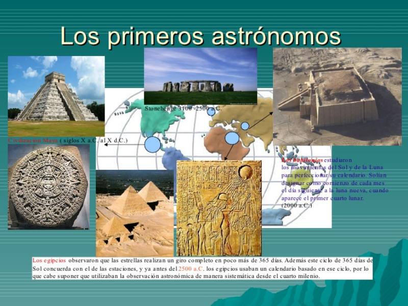 Los primeros astrónomos fueron humanos primitivos que, observando el cielo, se preguntaron por primera vez sobre el significado de las estrellas, la Luna y el Sol. Al principio con reverencia y temor, pero después con espíritu práctico. El hombre empezó a relacionar los acontecimientos del cielo con los cambios de estaciones y otros fenómenos. Este entendimiento fue fundamental para los primeros agricultores y ganaderos, incluso para cazadores- recolectores, pues les indicaba cuándo sembrar o cuándo cosechar, que plantas o animales podían hallar en cada época del año, etc. La necesidad de poder predecir las estaciones llevó a un registro sistemático de las observaciones astronómicas, quizá como ritual religioso al principio, y así el conocimiento se incrementó y pasó de generación en generación. Aunque hace más de 9.000 años que hay evidencia de observaciones astronómicas, los verdaderos “padres” de la astrología (el estudio de los astros) fueron los babilonios, 2500 años AC, que describieron el movimiento del Sol, la Luna y los planetas, inventaron el sistema sexagesimal (que se mantiene en la hora y los ángulos), el zodiaco y los primeros calendarios.