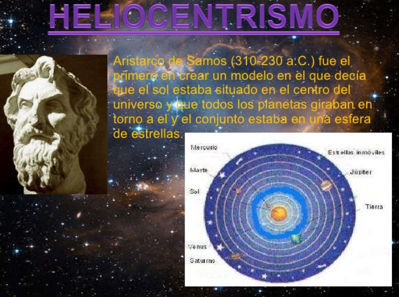 Los primeros estudios científicos de los astros no distinguían la astrología de la astronomía y mitos y hechos se mezclaban en sus explicaciones. Poco a poco, el razonamiento matemático y las leyes físicas se impusieron dando lugar a la astronomía moderna. Algunos de los nombres más importantes en esta transición son los siguientes: Aristóteles (384-322 aC), filósofo griego, propuso un sistema geocéntrico, con la Tierra en el centro del universo y todo los demás cuerpos conocidos girando en esferas perfectas alrededor. Aristarco de Samos (310-230 aC), jónico, ignoró a Aristóteles, haciendo sus propios cálculos y proponiendo un modelo heliocéntrico. El Sol, que consideró mucho mayor que la Tierra, estaría en el centro. Eratóstenes (276-174 aC) calculó con mucha precisión el perímetro y el radio de la Tierra. Hiparco de Nicea (190-120 aC) elaboró el primer mapa estelar con más de 850 estrellas. Ptolomeo (100-170 dC) revisó los escritos de Aristóteles, adoptando su modelo geocéntrico y mejorándolo mediante numerosos cálculos matemáticos. Todo ello lo publicó en una obra monumental: Almagesto. Aunque tremendamente complejo, el modelo fue aceptado por su gran capacidad predictiva y porque concordaba con las ideas religiosas cristianas imperantes. Cualquier idea contraria era considerada herejía y podía suponer una condena a muerte. Copérnico (1473-1543 dC) tras más de 1300 años de astronomía ptolemaica aparece uno de los mayores astrónomos de todos los tiempos. Copérnico retomó la idea de un universo heliocéntrico, rehízo todos los cálculos matemáticos y obtuvo un modelo racional y de una sencillez y belleza excepcional. Sin embargo, por miedo a la Iglesia, no publicó sus ideas hasta el año de su muerte. Décadas después, Kepler (1571-1630), basándose en las detalladas observaciones de Tycho Brahe, descubre que las órbitas de los planetas son elípticas, y no circulares como pensaba Copérnico. Giordano Bruno (1548-1600 dC) admirador de Copérnico, del que tomó su modelo heliocéntrico, fue más allá en sus ideas y afirmó que el universo es infinito y que las estrellas nocturnas son otros tantos soles con planetas y seres vivos como en el nuestro. Sus ideas, consideradas heréticas, le condujeron a ser arrestado, juzgado y condenado a la hoguera, donde murió sin retractarse de sus ideas. Galileo (1564-1642 dC) coetáneo de Bruno y Kepler, construyó un telescopio que le permitió realizar observaciones asombrosas: descubrió 4 lunas de Júpiter y los anillos de Saturno. Hizo precisos cálculos que consolidaron el modelo copernicano. Perseguido por la iglesia, encarcelado y juzgado, se retractó de sus ideas, por miedo a acabar como Bruno. Se le condenó a arresto domiciliario hasta que murió. La iglesia católica no los rehabilitó hasta 1992. Newton (1643-1727 dC) considerado el científico más importante de la historia debido a sus múltiples aportaciones, estableció la teoría de la gravitación universal, que explicaba por fin el movimiento de los cuerpos celestes. El modelo heliocéntrico quedó establecido de forma definitiva e incuestionable.